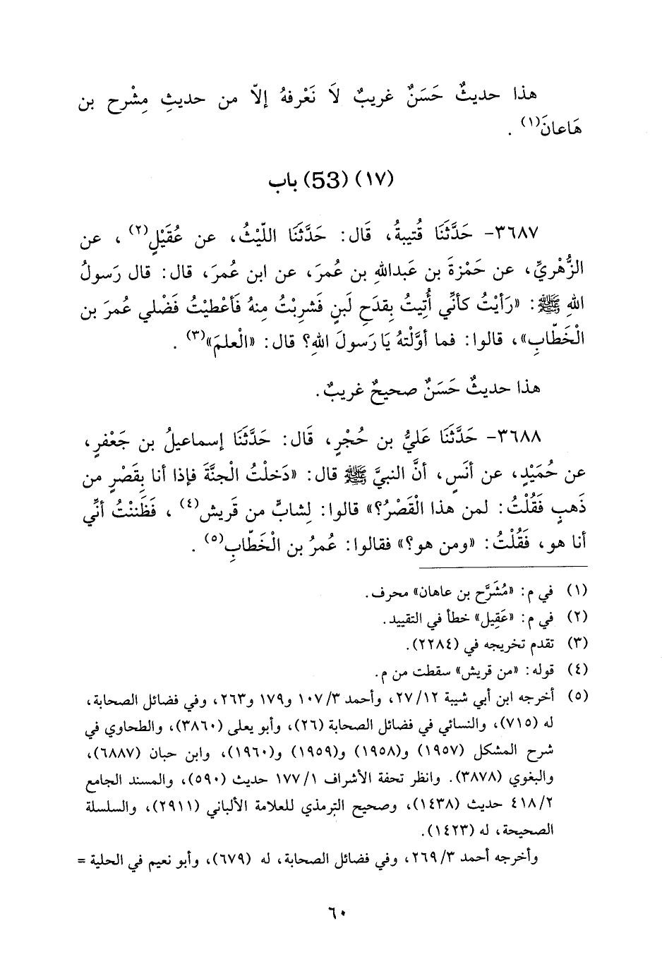 3686 - حَدَّثَنَا سَلَمَةُ بْنُ شَبِيبٍ، قَالَ: حَدَّثَنَا الْمُقْرِئُ، عَنْ حَيْوَةَ بْنِ شُرَيْحٍ، عَنْ بَكْرِ بْنِ عَمْرٍو، عَنْ مِشْرَحِ بْنِ هَاعَانَ، عَنْ عُقْبَةَ بْنِ عَامِرٍ، قَالَ: قَالَ رَسُولُ اللهِ صَلَّى اللَّهُ عَلَيْهِ وَسَلَّمَ: لَوْ كَانَ نَبِيٌّ بَعْدِي لَكَانَ عُمَرَ بْنَ الخَطَّابِ.
