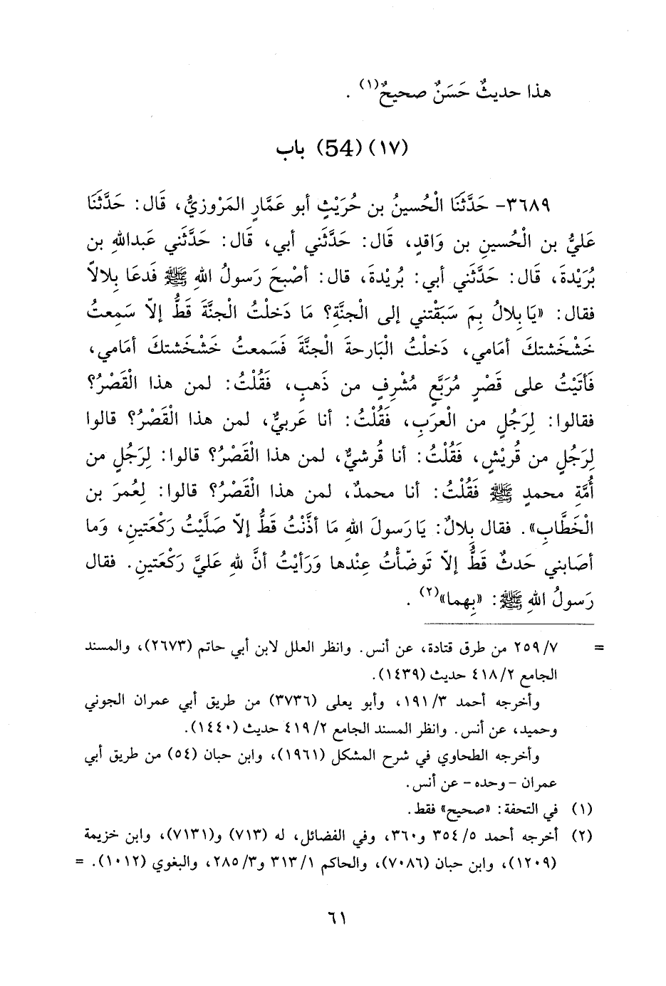3689 - حَدَّثَنَا الحُسَيْنُ بْنُ حُرَيْثٍ أَبُو عَمَّارٍ الْمَرْوَزِيُّ، قَالَ: حَدَّثَنَا عَلِيُّ بْنُ الحُسَيْنِ بْنِ وَاقِدٍ قَالَ: حَدَّثَنِي أَبِي قَالَ: حَدَّثَنِي عَبْدُ اللهِ بْنُ بُرَيْدَةَ، قَالَ: حَدَّثَنِي أَبِي بُرَيْدَةَ، قَالَ: أَصْبَحَ رَسُولُ اللهِ صَلَّى اللَّهُ عَلَيْهِ وَسَلَّمَ فَدَعَا بِلاَلاً فَقَالَ: يَا بِلاَلُ بِمَ سَبَقْتَنِي إِلَى الجَنَّةِ؟ مَا دَخَلْتُ الجَنَّةَ قَطُّ إِلاَّ سَمِعْتُ خَشْخَشَتَكَ أَمَامِي، دَخَلْتُ البَارِحَةَ الجَنَّةَ فَسَمِعْتُ خَشْخَشَتَكَ أَمَامِي، فَأَتَيْتُ عَلَى قَصْرٍ مُرَبَّعٍ مُشْرِفٍ مِنْ ذَهَبٍ، فَقُلْتُ: لِمَنْ هَذَا القَصْرُ؟ فَقَالُوا: لِرَجُلٍ مِنَ العَرَبِ، فَقُلْتُ: أَنَا عَرَبِيٌّ، لِمَنْ هَذَا القَصْرُ؟ قَالُوا لِرَجُلٍ مِنْ قُرَيْشٍ، فَقُلْتُ: أَنَا قُرَشِيٌّ، لِمَنْ هَذَا القَصْرُ؟ قَالُوا: لِرَجُلٍ مِنْ أُمَّةِ مُحَمَّدٍ صَلَّى اللَّهُ عَلَيْهِ وَسَلَّمَ، فَقُلْتُ: أَنَا مُحَمَّدٌ لِمَنْ هَذَا القَصْرُ؟ قَالُوا: لِعُمَرَ بْنِ الخَطَّابِ. فَقَالَ بِلاَلٌ: يَا رَسُولَ اللهِ مَا أَذَّنْتُ قَطُّ إِلاَّ صَلَّيْتُ رَكْعَتَيْنِ، وَمَا أَصَابَنِي حَدَثٌ قَطُّ إِلاَّ تَوَضَّأْتُ عِنْدَهَا وَرَأَيْتُ أَنَّ لِلَّهِ عَلَيَّ رَكْعَتَيْنِ. فَقَالَ رَسُولُ اللهِ صَلَّى اللَّهُ عَلَيْهِ وَسَلَّمَ: بِهِمَا.