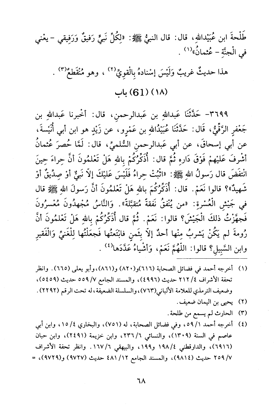 3703 - حَدَّثَنَا عَبْدُ اللهِ بْنُ عَبْدِ الرَّحْمَنِ، وَعَبَّاسُ بْنُ مُحَمَّدٍ الدُّورِيُّ، وَغَيْرُ وَاحِدٍ الْمَعْنَى وَاحِدٌ، قَالُوا: حَدَّثَنَا سَعِيدُ بْنُ عَامِرٍ، قَالَ: عَبْدُ اللهِ، أَخْبَرَنَا سَعِيدُ بْنُ عَامِرٍ، عَنْ يَحْيَى بْنِ أَبِي الحَجَّاجِ الْمَنْقَرِيِّ، عَنْ أَبِي مَسْعُودٍ الجُرَيْرِيِّ، عَنْ ثُمَامَةَ بْنِ حَزْنٍ القُشَيْرِيِّ، قَالَ: شَهِدْتُ الدَّارَ حِينَ أَشْرَفَ عَلَيْهِمْ عُثْمَانُ، فَقَالَ: ائْتُونِي بِصَاحِبَيْكُمُ اللَّذَيْنِ أَلَّبَاكُمْ عَلَيَّ. قَالَ: فَجِيءَ بِهِمَا فَكَأَنَّهُمَا جَمَلاَنِ أَوْ كَأَنَّهُمَا حِمَارَانِ، قَالَ: فَأَشْرَفَ عَلَيْهِمْ عُثْمَانُ، فَقَالَ: أَنْشُدُكُمْ بِاللَّهِ وَالإِسْلاَمِ هَلْ تَعْلَمُونَ أَنَّ رَسُولَ اللهِ صَلَّى اللَّهُ عَلَيْهِ وَسَلَّمَ قَدِمَ الْمَدِينَةَ وَلَيْسَ بِهَا مَاءٌ يُسْتَعْذَبُ غَيْرَ بِئْرِ رُومَةَ فَقَالَ رَسُولُ اللهِ صَلَّى اللَّهُ عَلَيْهِ وَسَلَّمَ: مَنْ يَشْتَرِي بِئْرَ رُومَةَ فَيَجْعَلَ دَلْوَهُ مَعَ دِلاَءِ الْمُسْلِمِينَ بِخَيْرٍ لَهُ مِنْهَا فِي الْجَنَّةِ؟ فَاشْتَرَيْتُهَا مِنْ صُلْبِ مَالِي فَأَنْتُمُ اليَوْمَ تَمْنَعُونِي أَنْ أَشْرَبَ مِنْهَا حَتَّى أَشْرَبَ مِنْ مَاءِ الْبَحْرِ. قَالُوا: اللَّهُمَّ نَعَمْ. فَقَالَ: أَنْشُدُكُمْ بِاللَّهِ وَالْإِسْلاَمِ هَلْ تَعْلَمُونَ أَنَّ الْمَسْجِدَ ضَاقَ بِأَهْلِهِ، فَقَالَ رَسُولُ اللهِ صَلَّى اللَّهُ عَلَيْهِ وَسَلَّمَ: مَنْ يَشْتَرِي بُقْعَةَ آلِ فُلاَنٍ فَيَزِيدَهَا فِي الْمَسْجِدِ بِخَيْرٍ لَهُ مِنْهَا فِي الجَنَّةِ؟ فَاشْتَرَيْتُهَا مِنْ صُلْبِ مَالِي فَأَنْتُمُ اليَوْمَ تَمْنَعُونِي أَنْ أُصَلِّيَ فِيهَا رَكْعَتَيْنِ؟ قَالُوا: اللَّهُمَّ، نَعَمْ. قَالَ: أَنْشُدُكُمْ بِاللَّهِ وَبِالْإِسْلاَمِ، هَلْ تَعْلَمُونَ أَنِّي جَهَّزْتُ جَيْشَ العُسْرَةِ مِنْ مَالِي؟ قَالُوا: اللَّهُمَّ نَعَمْ. ثُمَّ قَالَ: أَنْشُدُكُمْ بِاللَّهِ وَالإِسْلاَمِ هَلْ تَعْلَمُونَ أَنَّ رَسُولَ اللهِ صَلَّى اللَّهُ عَلَيْهِ وَسَلَّمَ كَانَ عَلَى ثَبِيرِ مَكَّةَ وَمَعَهُ أَبُو بَكْرٍ وَعُمَرُ وَأَنَا فَتَحَرَّكَ الجَبَلُ حَتَّى تَسَاقَطَتْ حِجَارَتُهُ بِالحَضِيضِ قَالَ: فَرَكَضَهُ بِرِجْلِهِ وَقَالَ: اسْكُنْ ثَبِيرُ فَإِنَّمَا عَلَيْكَ نَبِيٌّ وَصِدِّيقٌ وَشَهِيدَانِ؟ قَالُوا: اللَّهُمَّ، نَعَمْ. قَالَ: اللَّهُ أَكْبَرُ شَهِدُوا لِي وَرَبِّ الكَعْبَةِ أَنِّي شَهِيدٌ، ثَلاَثًا.