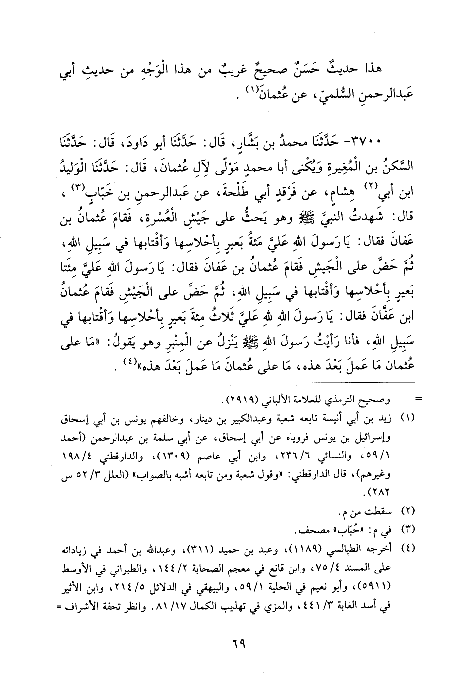 3704 - حَدَّثَنَا مُحَمَّدُ بْنُ بَشَّارٍ، قَالَ: حَدَّثَنَا عَبْدُ الوَهَّابِ الثَّقَفِيُّ، قَالَ: حَدَّثَنَا أَيُّوبُ، عَنْ أَبِي قِلاَبَةَ، عَنْ أَبِي الأَشْعَثِ الصَّنْعَانِيِّ، أَنَّ خُطَبَاءَ قَامَتْ بِالشَّامِ وَفِيهِمْ رِجَالٌ مِنْ أَصْحَابِ رَسُولِ اللهِ صَلَّى اللَّهُ عَلَيْهِ وَسَلَّمَ، فَقَامَ آخِرُهُمْ رَجُلٌ يُقَالُ لَهُ: مُرَّةُ بْنُ كَعْبٍ، فَقَالَ: لَوْلاَ حَدِيثٌ سَمِعْتُهُ مِنْ رَسُولِ اللهِ صَلَّى اللَّهُ عَلَيْهِ وَسَلَّمَ مَا قُمْتُ وَذَكَرَ الفِتَنَ فَقَرَّبَهَا، فَمَرَّ رَجُلٌ مُقَنَّعٌ فِي ثَوْبٍ فَقَالَ: هَذَا يَوْمَئِذٍ عَلَى الهُدَى، فَقُمْتُ إِلَيْهِ فَإِذَا هُوَ عُثْمَانُ بْنُ عَفَّانَ. قَالَ: فَأَقْبَلْتُ عَلَيْهِ بِوَجْهِهِ، فَقُلْتُ: هَذَا؟ قَالَ: نَعَمْ.