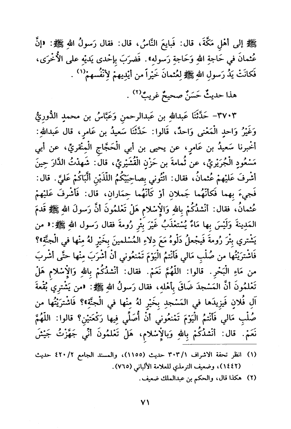 3709 - حَدَّثَنَا الفَضْلُ بْنُ أَبِي طَالِبٍ البَغْدَادِيُّ، وَغَيْرُ وَاحِدٍ، قَالُوا: حَدَّثَنَا عُثْمَانُ بْنُ زُفَرَ، قَالَ: حَدَّثَنَا مُحَمَّدُ بْنُ زِيَادٍ، عَنْ مُحَمَّدِ بْنِ عَجْلاَنَ، عَنْ أَبِي الزُّبَيْرِ، عَنْ جَابِرٍ، قَالَ: أُتِيَ رَسُولُ اللهِ صَلَّى اللَّهُ عَلَيْهِ وَسَلَّمَ بِجَنَازَةِ رَجُلٍ لِيُصَلِّيَ عَلَيْهِ فَلَمْ يُصَلِّ عَلَيْهِ، فَقِيلَ: يَا رَسُولَ اللهِ مَا رَأَيْنَاكَ تَرَكْتَ الصَّلاَةَ عَلَى أَحَدٍ قَبْلَ هَذَا؟ قَالَ: إِنَّهُ كَانَ يَبْغَضُ عُثْمَانَ فَأَبْغَضَهُ اللَّهُ.