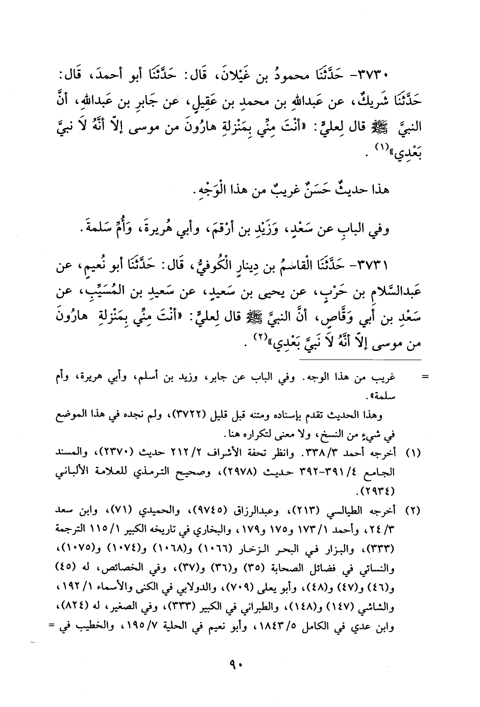 3733 - حَدَّثَنَا نَصْرُ بْنُ عَلِيٍّ الجَهْضَمِيُّ، قَالَ: حَدَّثَنَا عَلِيُّ بْنُ جَعْفَرِ بْنِ مُحَمَّدِ بْنِ عَلِيٍّ قَالَ: أَخْبَرَنِي أَخِي مُوسَى بْنُ جَعْفَرِ بْنِ مُحَمَّدٍ، عَنْ أَبِيهِ جَعْفَرِ بْنِ مُحَمَّدٍ، عَنْ أَبِيهِ مُحَمَّدِ بْنِ عَلِيٍّ عَنْ أَبِيهِ عَلِيِّ بْنِ الحُسَيْنِ، عَنْ أَبِيهِ، عَنْ جَدِّهِ عَلِيِّ بْنِ أَبِي طَالِبٍ، أَنَّ رَسُولَ اللهِ صَلَّى اللَّهُ عَلَيْهِ وَسَلَّمَ أَخَذَ بِيَدِ حَسَنٍ وَحُسَيْنٍ فَقَالَ: مَنْ أَحَبَّنِي وَأَحَبَّ هَذَيْنِ وَأَبَاهُمَا وَأُمَّهُمَا كَانَ مَعِي فِي دَرَجَتِي يَوْمَ القِيَامَةِ.
