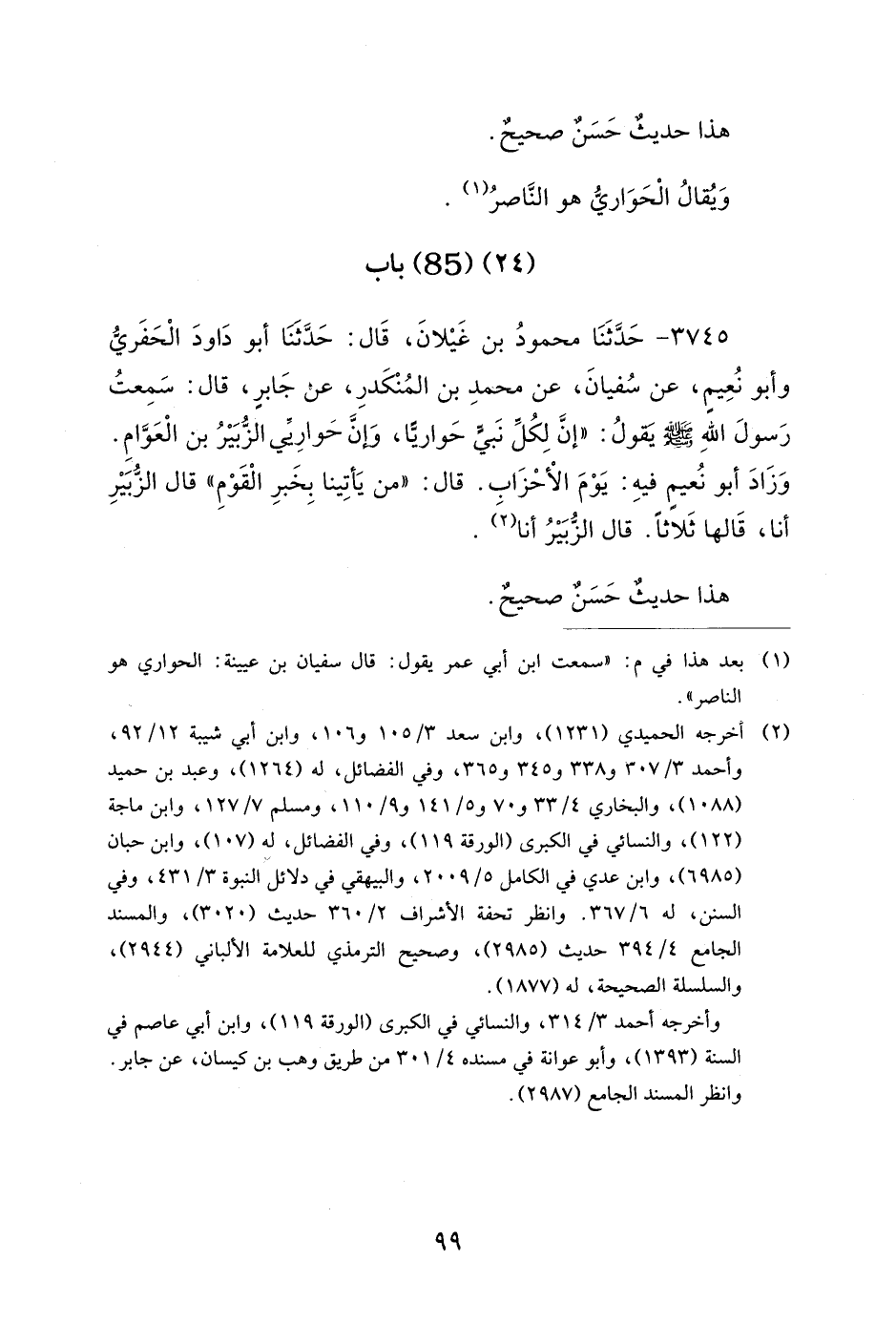 3745 - حَدَّثَنَا مَحْمُودُ بْنُ غَيْلاَنَ، قَالَ: حَدَّثَنَا أَبُو دَاوُدَ الحَفَرِيُّ، وَأَبُو نُعَيْمٍ، عَنْ سُفْيَانَ، عَنْ مُحَمَّدِ بْنِ الْمُنْكَدِرِ، عَنْ جَابِرٍ، قَالَ: سَمِعْتُ رَسُولَ اللهِ صَلَّى اللَّهُ عَلَيْهِ وَسَلَّمَ يَقُولُ: إِنَّ لِكُلِّ نَبِيٍّ حَوَارِيًّا وَإِنَّ حَوَارِيِّي الزُّبَيْرُ بْنُ العَوَّامِ وَزَادَ أَبُو نُعَيْمٍ فِيهِ: يَوْمَ الأَحْزَابِ. قَالَ: مَنْ يَأْتِينَا بِخَبَرِ القَوْمِ قَالَ الزُّبَيْرُ أَنَا، قَالَهَا ثَلاَثًا. قَالَ الزُّبَيْرُ أَنَا.