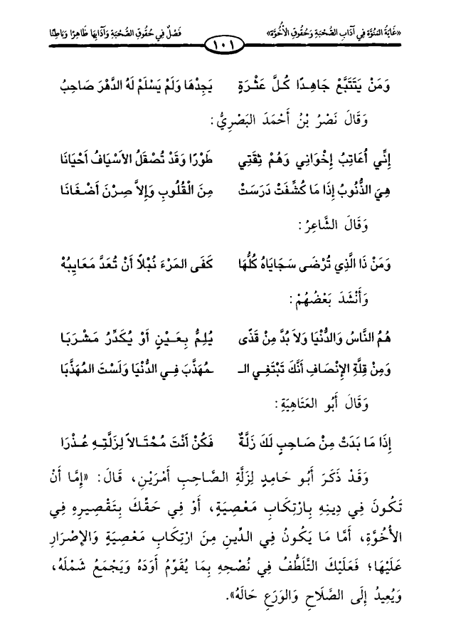 وقد ذكر أبو حامد لزلة الصاحب أمرين، قال: «إما أن تكون في دينه بارتكاب معصية، أو في حقك بتقصيره في الأخوة، أما ما يكون في الدين من ارتكاب معصية والإصرار عليها؛ فعليك التلطف في نصحه بما يقوم أوده ويجمع شمله، ويعيد إلى الصلاح والورع حاله».
