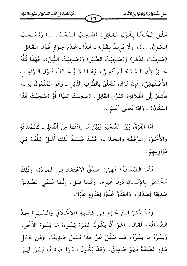 مثل الخطأ بقول القائل: (صحب النجم ... ) و (صحب الكون ... )، ولا يريد بقوله _ هذا _ عدم جواز قول القائل: (صحبت الدهر) و (صحبت الصبر) و (صحبت الليل)، فهذا كله جائز لأن المتكلم آدمي، وهذا لا يخالف قول الراغب الأصفهاني؛ فإن مراده متعلق بالطرف الثاني _ وهو المفعول به _، فأشار إلى إطلاقه؛ كقول القائل: (صحبت كلبًا) أو (صحبت هذا المكان) _ والله تعالى أعلم _.