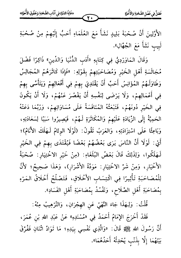 يكون في الخير دونهم، فتبعثه المنافسة على مساواتهم، وربما دعته الحمية إلى الزيادة عليهم والمكاثرة لهم، فيصيروا سببًا لسعادته، وباعثًا على استزادته، والعرب تقول: (لولا الوئام لهلك الأنام)؛ أي: لولا أن الناس يرى بعضهم بعضًا فيقتدى بهم في الخير لهلكوا، ولذلك قال بعض البلغاء: (من خير الاختيار: صحبة الأخيار، ومن شر الاختيار: مودة الأشرار)، وهذا صحيح؛ لأن للمصاحبة تأثيرًا في اكتساب الأخلاق، فتصلح أخلاق المرء بمصاحبة أهل الصلاح، وتفسد بمصاحبة أهل الفساد».