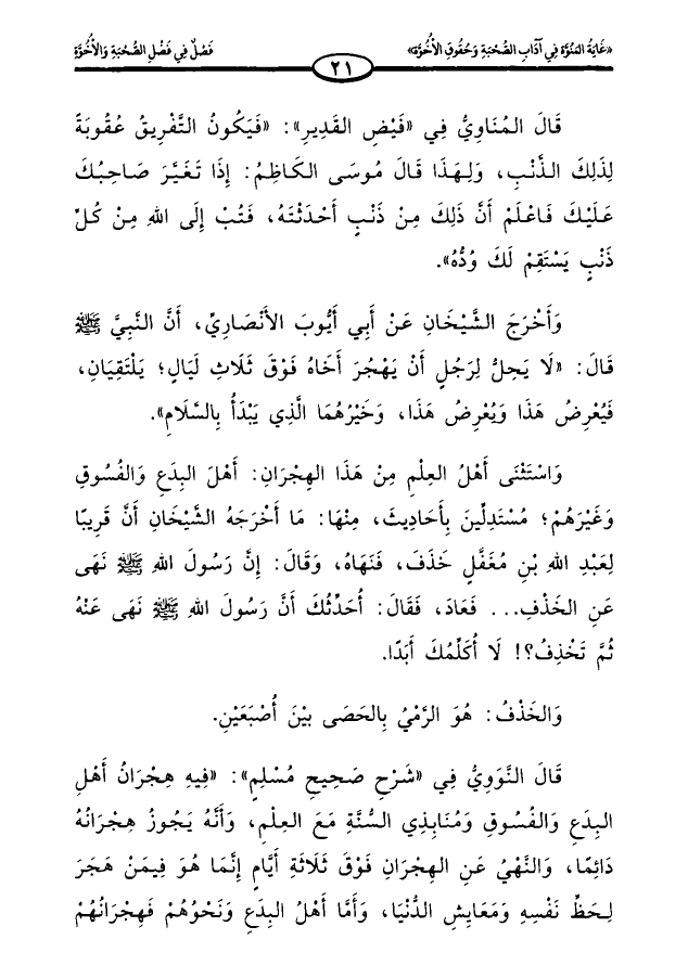 قال النووي في «شرح صحيح مسلم»: «فيه هجران أهل البدع والفسوق ومنابذي السنة مع العلم، وأنه يجوز هجرانه دائمًا، والنهي عن الهجران فوق ثلاثة أيام إنما هو فيمن هجر لحظ نفسه ومعايش الدنيا، وأما أهل البدع ونحوهم فهجرانهم