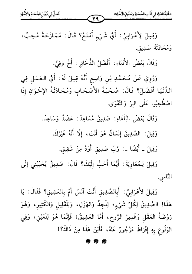 وقيل لأعرابي: أبالصديق أنت آنس أم بالعشيق؟ فقال: يا هذا! الصديق لكل شيء؛ للجد والهزل، وللقليل والكثير، وهو روضة العقل وغدير الروح، أما العشيق؛ فإنما هو للعين، وفي الولوع به إفراط مزجور عنه، فأين هذا من ذاك؟!