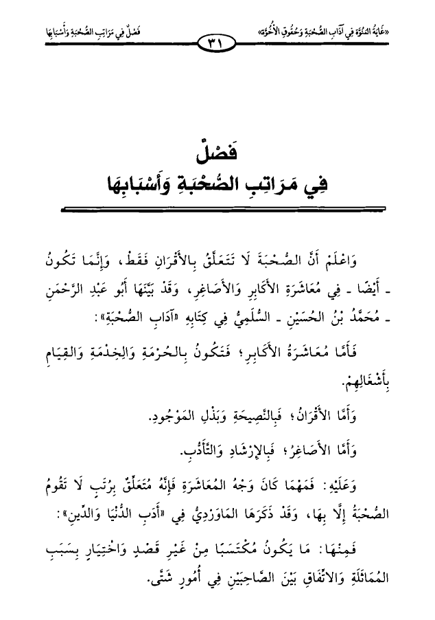 واعلم أن الصحبة لا تتعلق بالأقران فقط، وإنما تكون _ أيضًا _ في معاشرة الأكابر والأصاغر، وقد بينها أبو عبد الرحمن _ محمد بن الحسين _ السلمي في كتابه «آداب الصحبة»: