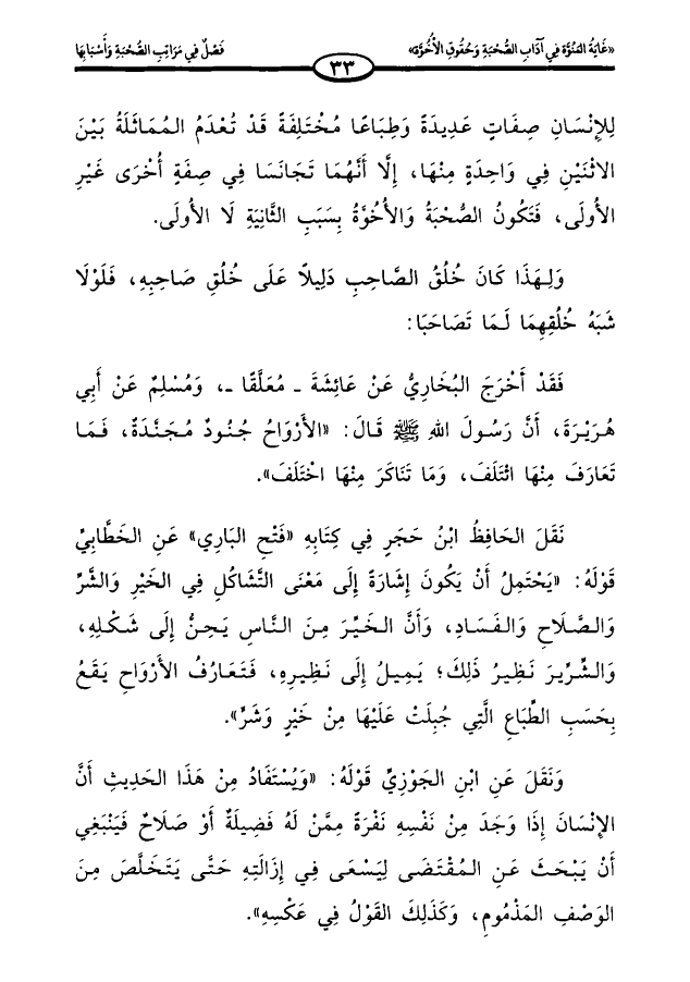 للإنسان صفات عديدةً وطباعًا مختلفةً قد تعدم المماثلة بين الاثنين في واحدة منها، إلا أنهما تجانسا في صفة أخرى غير الأولى، فتكون الصحبة والأخوة بسبب الثانية لا الأولى.