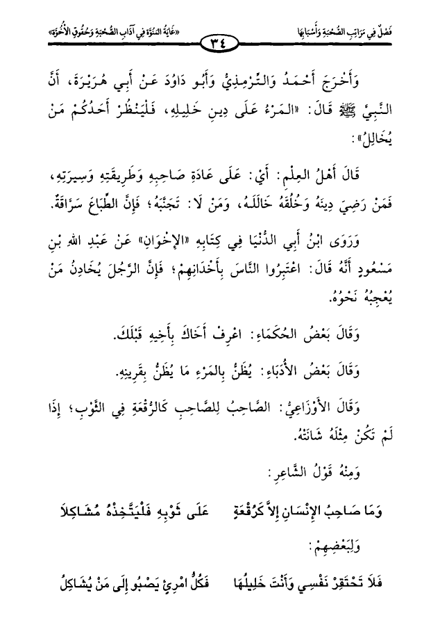 وأخرج أحمد والترمذي وأبو داود عن أبي هريرة، أن النبي صلى الله عليه وسلم قال: «المرء على دين خليله، فلينظر أحدكم من يخالل»: