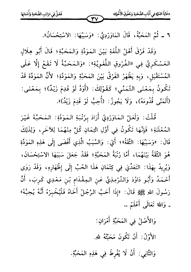 قلت: ولعل الماوردي أراد برتبة المودة: المحبة غير المعلنة؛ فإنها تكون في أول ائتمان كل منهما للآخر، ولذلك قال: «وسببها: الثقة»؛ أي: والسبب الذي أفضى إلى هذه المودة هو الثقة بينهما، أما رتبة المحبة؛ فقد جعل سببها الاستحسان، ويريد بهذا: التعدي في كتمان هذا الحب إلى إظهاره، وقد روى أحمد وأبو داود والترمذي عن المقدام بن معدي كرب، أن رسول الله صلى الله عليه وسلم قال: «إذا أحب الرجل أخاه فليخبره أنه يحبه» _ والله تعالى أعلم _.