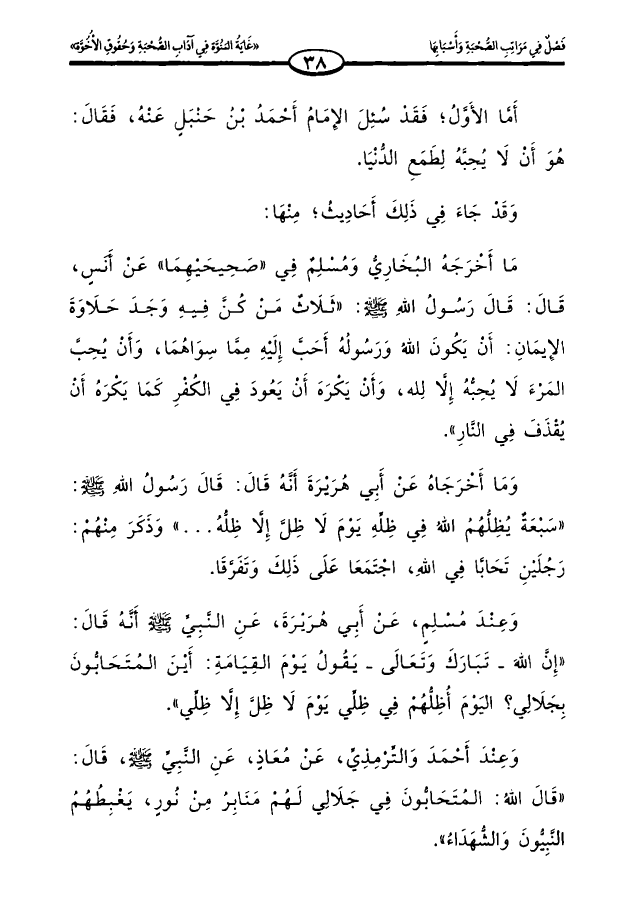 ما أخرجه البخاري ومسلم في «صحيحيهما» عن أنس، قال: قال رسول الله صلى الله عليه وسلم: «ثلاث من كن فيه وجد حلاوة الإيمان: أن يكون الله ورسوله أحب إليه مما سواهما، وأن يحب المرء لا يحبه إلا لله، وأن يكره أن يعود في الكفر كما يكره أن يقذف في النار».