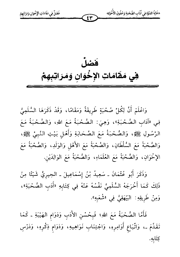 واعلم أن لكل صحبة طريقةً ومقامًا، وقد ذكرها السلمي في «آداب الصحبة»، وهي: الصحبة مع الله، والصحبة مع الرسول صلى الله عليه وسلم، والصحبة مع الصحابة وأهل بيت النبي صلى الله عليه وسلم، والصحبة مع السلطان، والصحبة مع الأهل والولد، والصحبة مع الإخوان، والصحبة مع العلماء، والصحبة مع الوالدين.