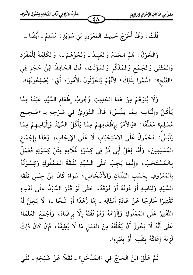 ولا يتوهم من هذا الحديث وجوب إطعام السيد عبده مما يأكل وإلباسه مما يلبس؛ قال النووي في شرحه لـ «صحيح مسلم» معلقًا: «والأمر بإطعامهم مما يأكل السيد وإلباسهم مما يلبس: محمول على الاستحباب لا على الإيجاب، وهذا بإجماع المسلمين، وأما فعل أبي ذر في كسوة غلامه مثل كسوته فعمل بالمستحب، وإنما يجب على السيد نفقة المملوك وكسوته بالمعروف بحسب البلدان والأشخاص؛ سواء كان من جنس نفقة السيد ولباسه أو دونه أو فوقه، حتى لو قتر السيد على نفسه تقتيرًا خارجًا عن عادة أمثاله _ إما زهدًا أو شحا _؛ لا يحل له التقتير على المملوك وإلزامه وموافقته إلا برضاه، وأجمع العلماء على أنه لا يجوز أن يكلفه من العمل ما لا يطيقه، فإن كان ذلك لزمه إعانته بنفسه أو بغيره».