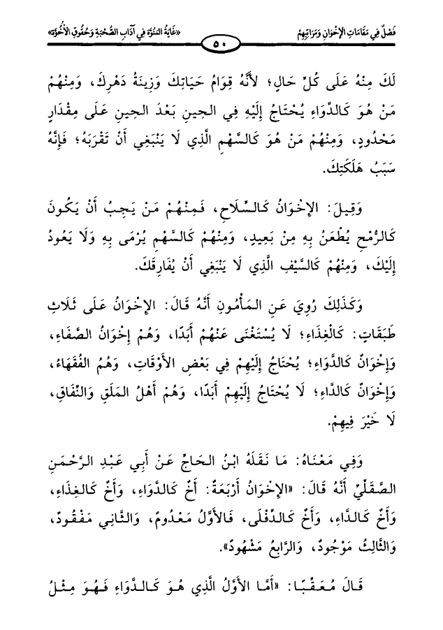 وفي معناه: ما نقله ابن الحاج عن أبي عبد الرحمن الصقلي أنه قال: «الإخوان أربعة: أخ كالدواء، وأخ كالغذاء، وأخ كالداء، وأخ كالدفلى، فالأول معدوم، والثاني مفقود، والثالث موجود، والرابع مشهود».