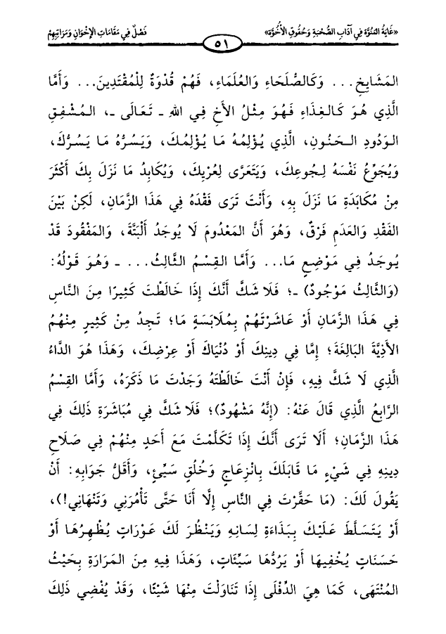 المشايخ ... وكالصلحاء والعلماء، فهم قدوة للمقتدين ... وأما الذي هو كالغذاء فهو مثل الأخ في الله _ تعالى _، المشفق الودود الحنون، الذي يؤلمه ما يؤلمك، ويسره ما يسرك، ويجوع نفسه لجوعك، ويتعرى لعريك، ويكابد ما نزل بك أكثر من مكابدة ما نزل به، وأنت ترى فقده في هذا الزمان، لكن بين الفقد والعدم فرق، وهو أن المعدوم لا يوجد ألبتة، والمفقود قد يوجد في موضع ما ... وأما القسم الثالث ... _ وهو قوله: (والثالث موجود) _؛ فلا شك أنك إذا خالطت كثيرًا من الناس في هذا الزمان أو عاشرتهم بملابسة ما؛ تجد من كثير منهم الأذية البالغة؛ إما في دينك أو دنياك أو عرضك، وهذا هو الداء الذي لا شك فيه، فإن أنت خالطته وجدت ما ذكره، وأما القسم الرابع الذي قال عنه: (إنه مشهود)؛ فلا شك في مباشرة ذلك في هذا الزمان؛ ألا ترى أنك إذا تكلمت مع أحد منهم في صلاح دينه