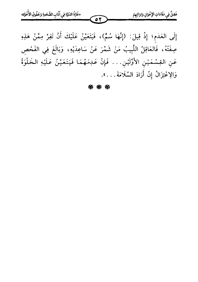 إلى العدم؛ إذ قيل: (إنها سم)، فيتعين عليك أن تفر ممن هذه صفته، فالعاقل اللبيب من شمر عن ساعديه، وبالغ في الفحص عن القسمين الأولين ... فإن عدمهما فيتعين عليه الخلوة والاعتزال إن أراد السلامة ... ».