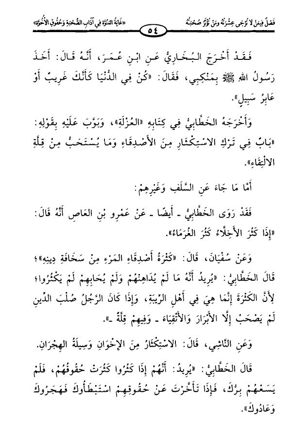 وعن سفيان، قال: «كثرة أصدقاء المرء من سخافة دينه»؛ قال الخطابي: «يريد أنه ما لم يداهنهم ولم يحابهم لم يكثروا؛ لأن الكثرة إنما هي في أهل الريبة، وإذا كان الرجل صلب الدين لم يصحب إلا الأبرار والأتقياء _ وفيهم قلة _».
