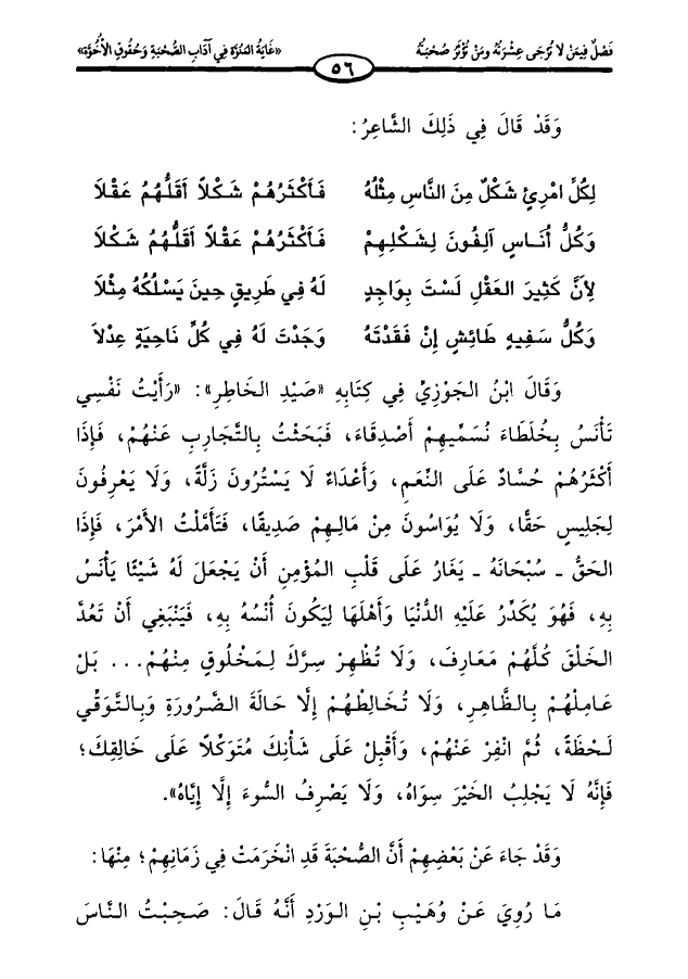 وقال ابن الجوزي في كتابه «صيد الخاطر»: «رأيت نفسي تأنس بخلطاء نسميهم أصدقاء، فبحثت بالتجارب عنهم، فإذا أكثرهم حساد على النعم، وأعداء لا يسترون زلةً، ولا يعرفون لجليس حقا، ولا يواسون من مالهم صديقًا، فتأملت الأمر، فإذا الحق _ سبحانه _ يغار على قلب المؤمن أن يجعل له شيئًا يأنس به، فهو يكدر عليه الدنيا وأهلها ليكون أنسه به، فينبغي أن تعد الخلق