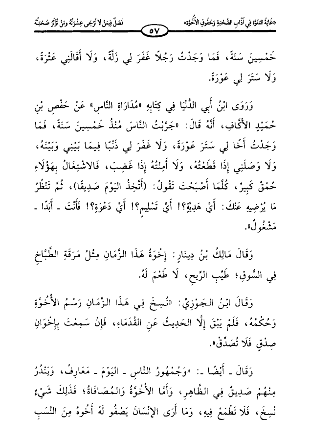 وروى ابن أبي الدنيا في كتابه «مداراة الناس» عن حفص بن حميد الأكاف، أنه قال: «جربت الناس منذ خمسين سنةً، فما وجدت أخًا لي ستر عورةً، ولا غفر لي ذنبًا فيما بيني وبينه، ولا وصلني إذا قطعته، ولا أمنته إذا غضب، فالاشتغال بهؤلاء حمق كبير، كلما أصبحت تقول: (أتخذ اليوم صديقًا)، ثم تنظر ما يرضيه عنك: أي هدية؟! أي تسليم؟! أي دعوة؟! فأنت _ أبدًا _ مشغول».