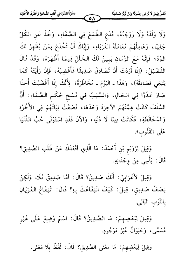 ولا ولده ولا زوجته، فدع الطمع في الصفاء، وخذ عن الكل جانبًا، وعاملهم معاملة الغرباء، وإياك أن تخدع بمن يظهر لك الود؛ فإنه مع الزمان يبين لك الخلل فيما أظهره، وقد قال الفضيل: (إذا أردت أن تصادق صديقًا فأغضبه، فإن رأيته كما ينبغي فصادقه)، وهذا _ اليوم _ مخاطرة؛ لأنك إذا أغضبت أحدًا صار عدوا في الحال، والسبب في نسخ حكم الصفاء: أن السلف كانت همتهم الآخرة وحدها، فصفت نياتهم في الأخوة والمخالطة، فكانت دينًا لا دنيا، والآن فقد استولى حب الدنيا على القلوب».