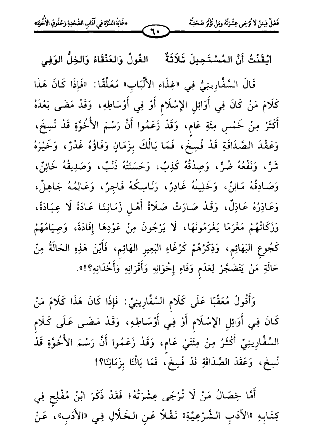 وأقول معقبًا على كلام السفاريني: فإذا كان هذا كلام من كان في أوائل الإسلام أو في أوساطه، وقد مضى على كلام السفاريني أكثر من مئتي عام، وقد زعموا أن رسم الأخوة قد نسخ، وعقد الصداقة قد فسخ، فما بالنا بزماننا؟!