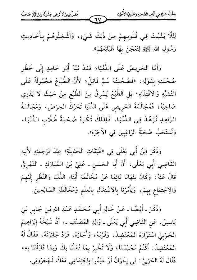 وذكر _ أيضًا _ عن خاله أبي محمد عبد الله بن جابر بن ياسين، عن القاضي أبي يعلى _ والد المصنف _، أن شيخه إبراهيم الحربي استزاره المعتضد، وقربه، وأجازه، فرد جائزته، فقال له المعتضد: اكتم مجلسنا، ولا تخبر بما فعلنا بك وبما قابلتنا به، فقال له الحربي: لي إخوان لو علموا باجتماعي معك لهجروني.