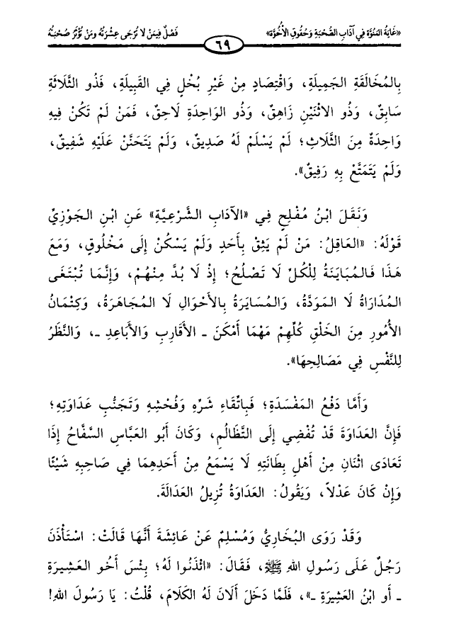 ونقل ابن مفلح في «الآداب الشرعية» عن ابن الجوزي قوله: «العاقل: من لم يثق بأحد ولم يسكن إلى مخلوق، ومع هذا فالمباينة للكل لا تصلح؛ إذ لا بد منهم، وإنما تبتغى المداراة لا المودة، والمسايرة بالأحوال لا المجاهرة، وكتمان الأمور من الخلق كلهم مهما أمكن _ الأقارب والأباعد _، والنظر للنفس في مصالحها».