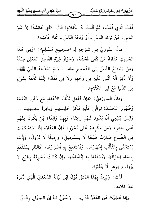 قال النووي في شرحه لـ «صحيح مسلم»: «وفي هذا الحديث مداراة من يتقى فحشه، وجواز غيبة الفاسق المعلن فسقه ومن يحتاج الناس إلى التحذير منه ... ولم يمدحه النبي صلى الله عليه وسلم، ولا ذكر أنه أثنى عليه في وجهه ولا في قفاه؛ إنما تألفه بشيء من الدنيا مع لين الكلام».