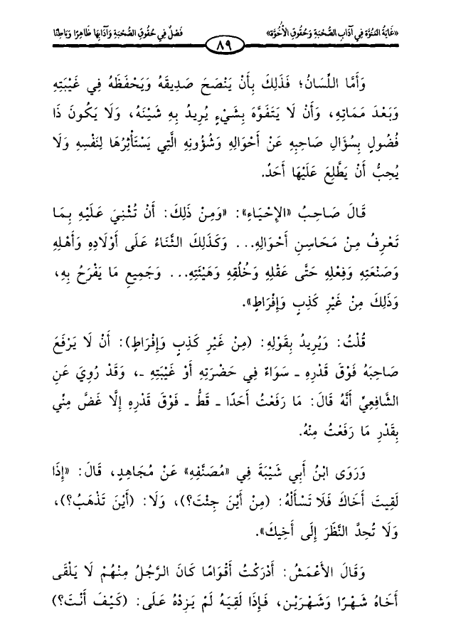 وأما اللسان؛ فذلك بأن ينصح صديقه ويحفظه في غيبته وبعد مماته، وأن لا يتفوه بشيء يريد به شينه، ولا يكون ذا فضول بسؤال صاحبه عن أحواله وشؤونه التي يستأثرها لنفسه ولا يحب أن يطلع عليها أحد.