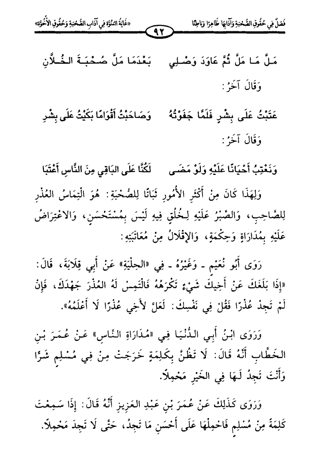 ولهذا كان من أكثر الأمور ثباتًا للصحبة: هو التماس العذر للصاحب، والصبر عليه لخلق فيه ليس بمستحسن، والاعتراض علىه بمداراة وحكمة، والإقلال من معاتبته: