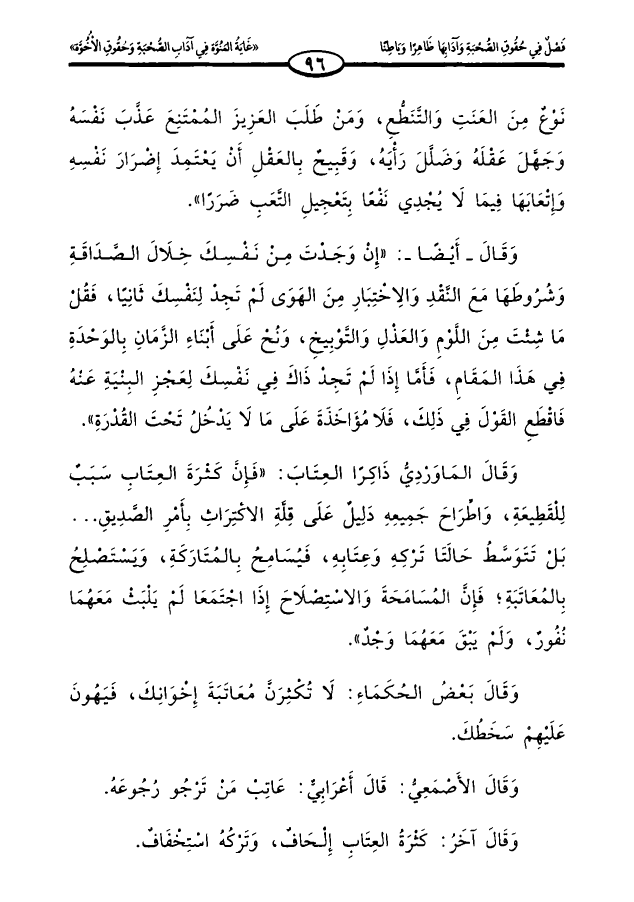 وقال الماوردي ذاكرًا العتاب: «فإن كثرة العتاب سبب للقطيعة، واطراح جميعه دليل على قلة الاكتراث بأمر الصديق ... بل تتوسط حالتا تركه وعتابه،