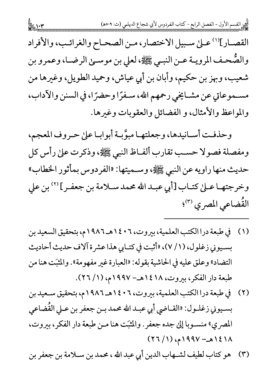 (¬٢) في طبعة درا الكتب العلمية، بيروت، ١٤٠٦ هـ ١٩٨٦ م، بتحقيق سعيد بن بسيوني زغلول: "القاضي أبي عبد الله محمد بن جعفر بن علي القُضاعي المصري" منسوبًا إلى جده جعفر. والمثبَت هنا من طبعة دار الفكر، بيروت، ١٤١٨ هـ -١٩٩٧ م، (١/ ٢٦).