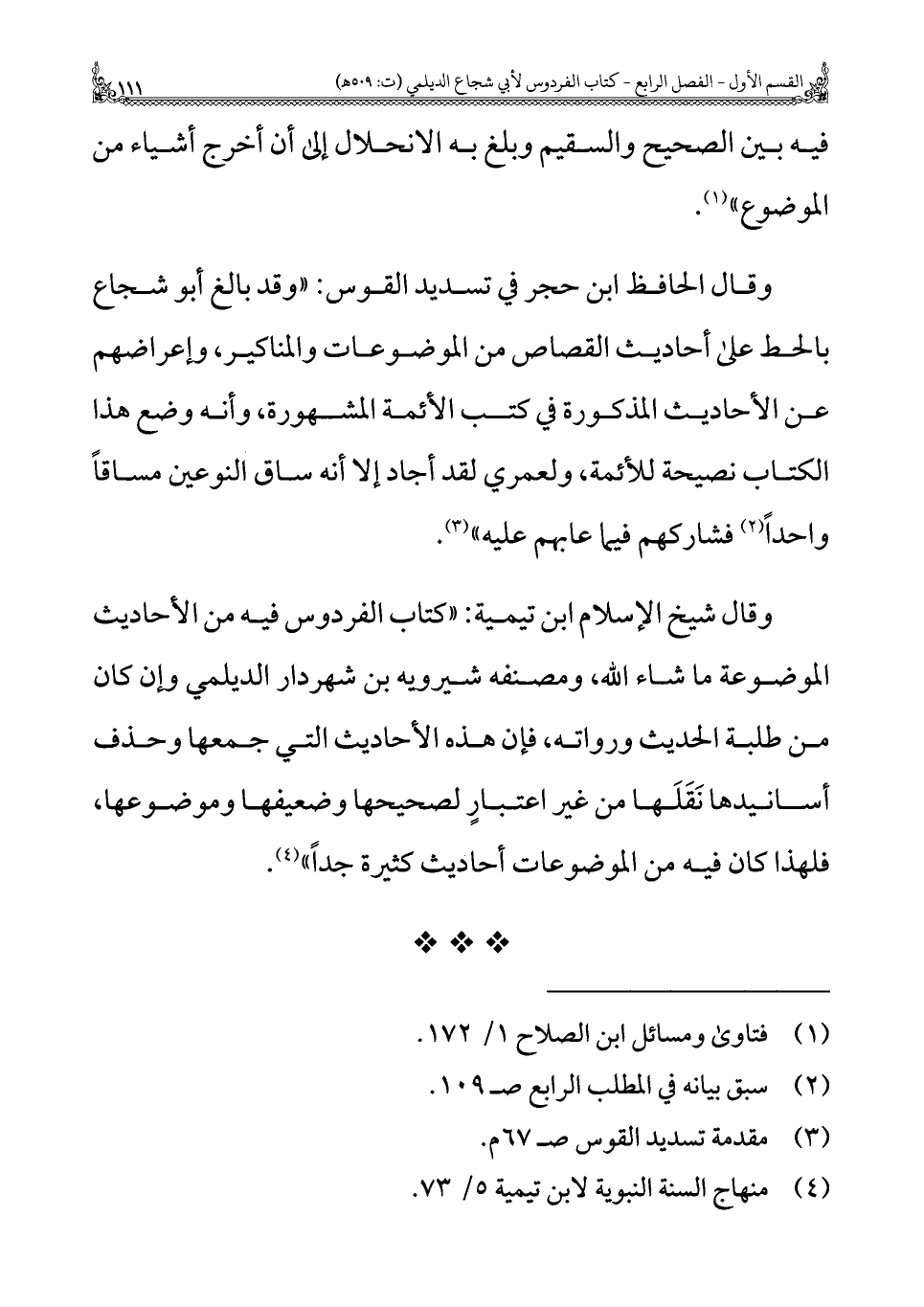 وقال شيخ الإسلام ابن تيمية: "كتاب الفردوس فيه من الأحاديث الموضوعة ما شاء الله، ومصنفه شيرويه بن شهردار الديلمي وإن كان من طلبة الحديث ورواته، فإن هذه الأحاديث التي جمعها وحذف أسانيدها نَقَلَها من غير اعتبار لصحيحها وضعيفها وموضوعها، فلهذا كان فيه من الموضوعات أحاديث كثيرة جدًّا" (¬٤).