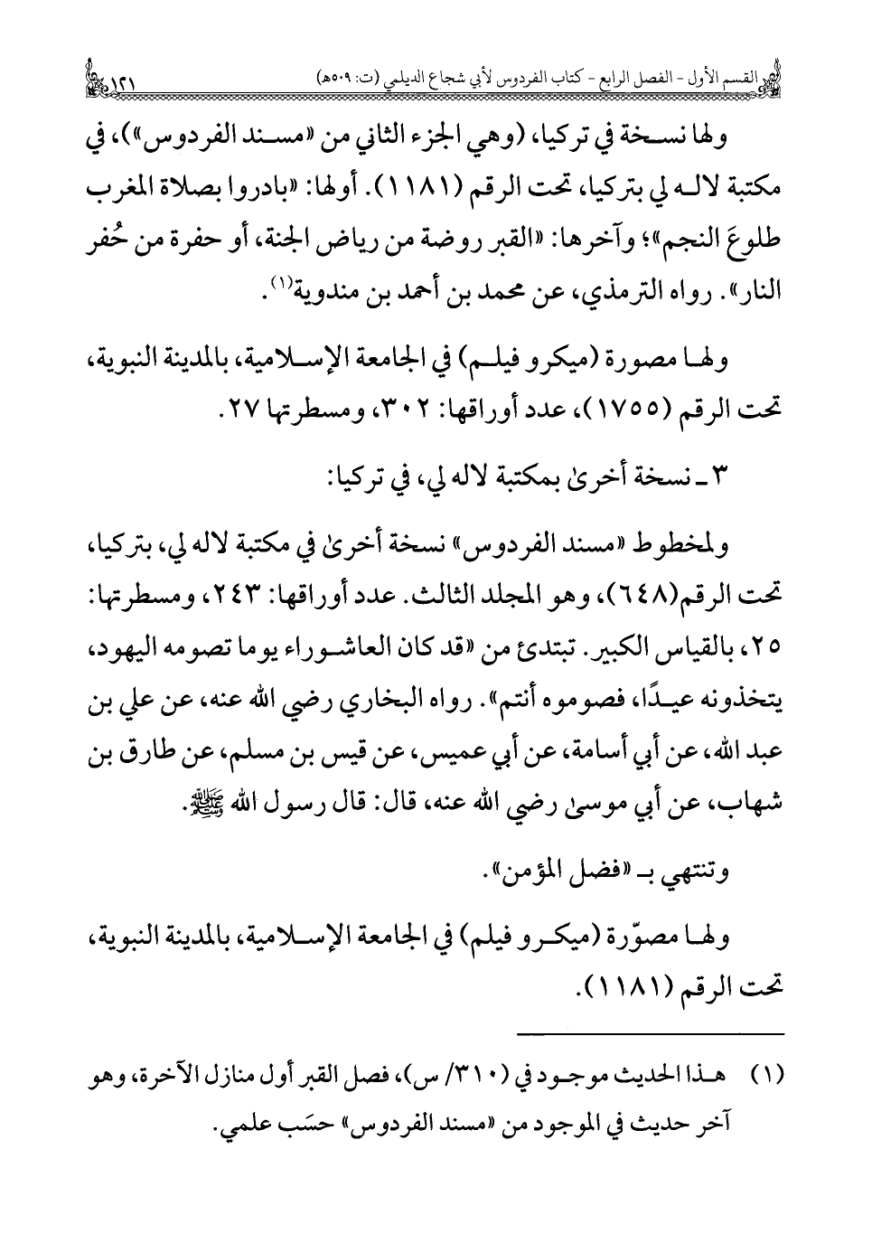 ولمخطوط "مسند الفردوس" نسخة أخرى في مكتبة لاله لي، بتركيا، تحت الرقم (٦٤٨)، وهو المجلد الثالث. عدد أوراقها: ٢٤٣، ومسطرتها: ٢٥، بالقياس الكبير. تبتدئ من "قد كان العاشوراء يومًا تصومه اليهود، يتخذونه عيدًا، فصوموه أنتم". رواه البخاري رضي الله عنه، عن علي بن عبد الله، عن أبي أسامة، عن أبي عميس، عن قيس بن مسلم، عن طارق بن شهاب، عن أبي موسى رضي الله عنه، قال: قال رسول الله - صلى الله عليه وسلم -.