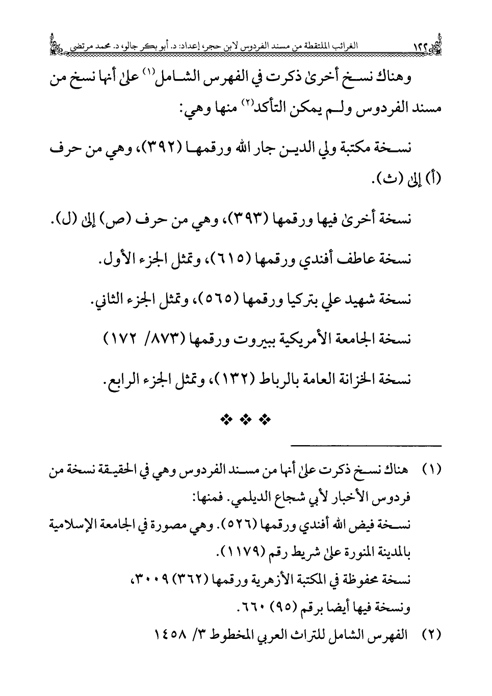 (¬١) هناك نسخ ذكرت على أنها من مسند الفردوس وهي في الحقيقة نسخة من فردوس الأخبار لأبي شجاع الديلمي. فمنها:
