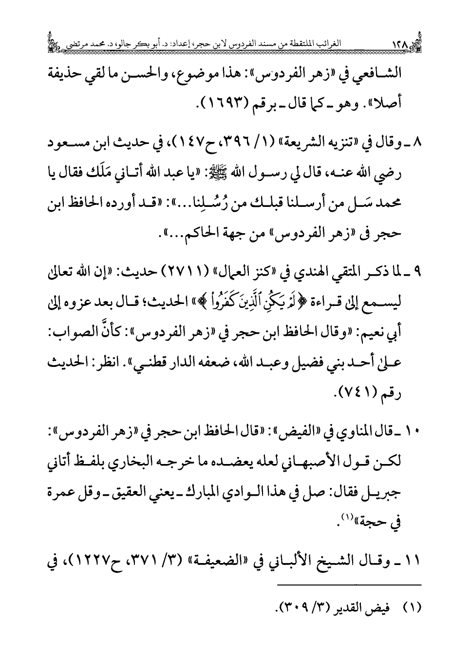 ٩ - لما ذكر المتقي الهندي في "كنز العمال" (٢٧١١) حديث: "إن الله تعالى ليسمع إلى قراءة {لَمْ يَكُنِ الَّذِينَ كَفَرُوا} " الحديث؛ قال بعد عزوه إلى أبي نعيم: "وقال الحافظ ابن حجر في "زهر الفردوس": كأنَّ الصواب: على أحد بني فضيل وعبد الله، ضعفه الدارقطني". انظر: الحديث رقم (٧٤١).