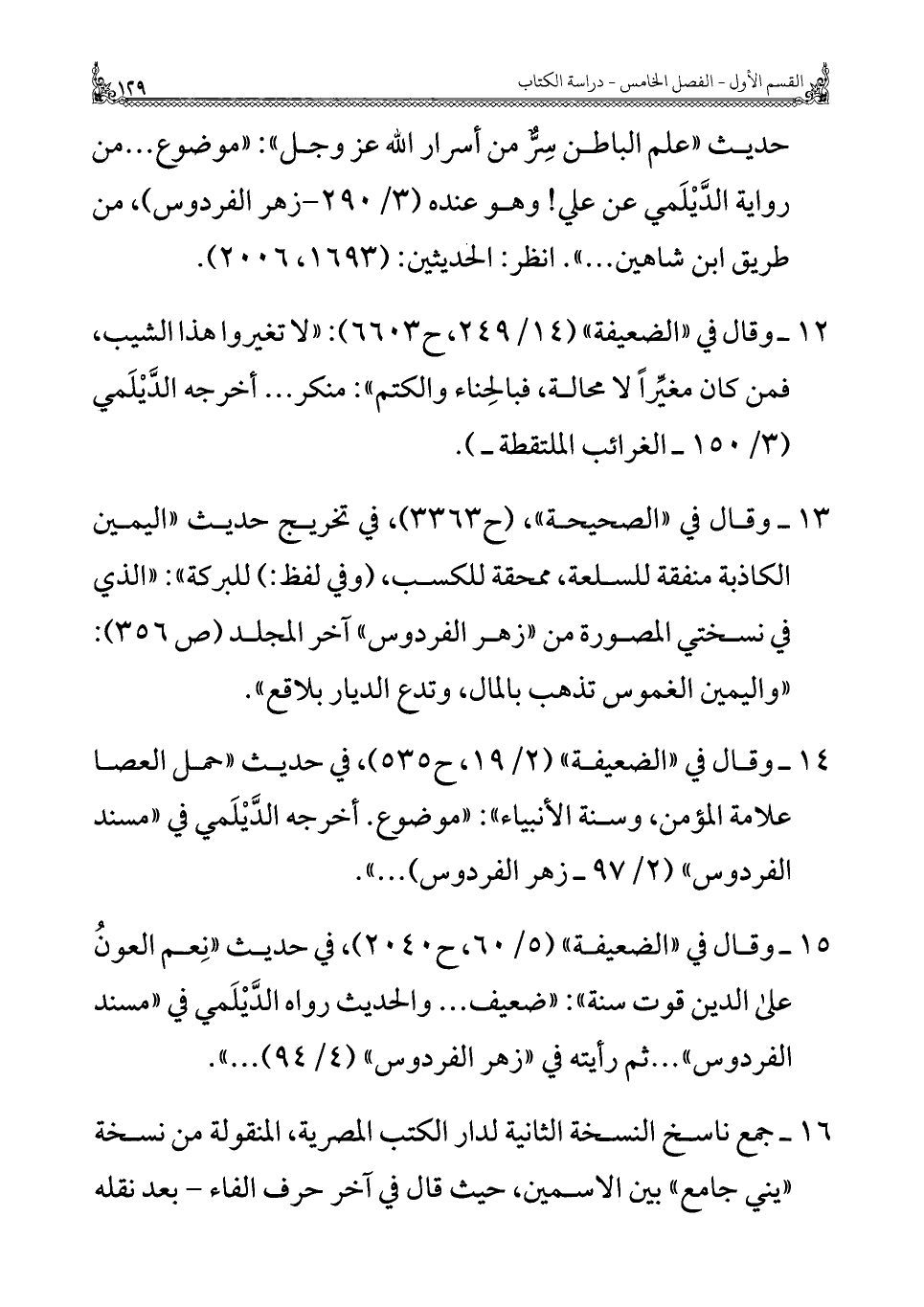 ١٥ - وقال في "الضعيفة" (٥/ ٦٠، ح ٢٠٤٠)، في حديث "نِعم العونُ على الدين قوت سنة": "ضعيف ... والحديث رواه الدَّيْلَمي في "مسند الفردوس". . . ثم رأيته في "زهر الفردوس" (٤/ ٩٤) ... ".