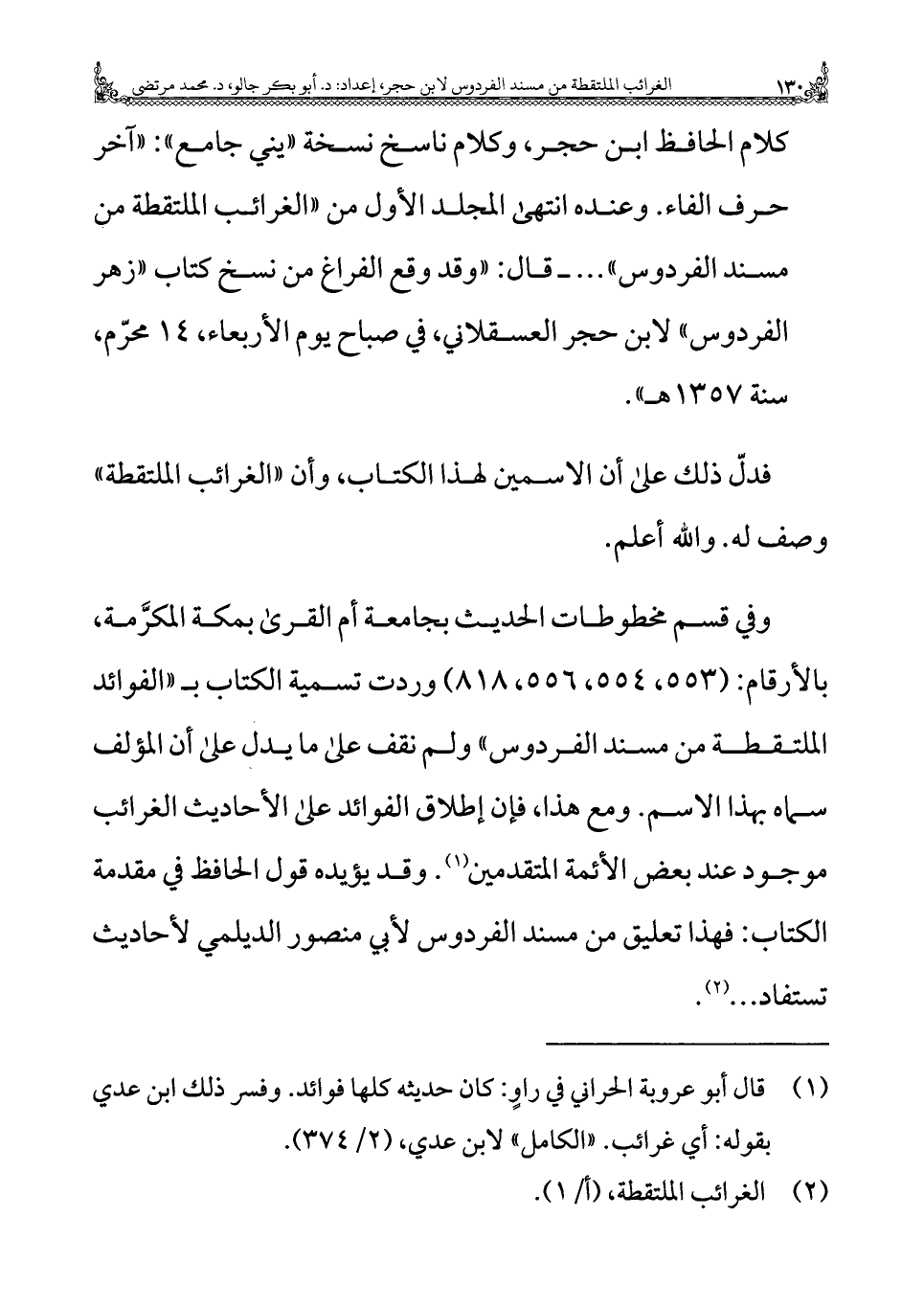 وفي قسم مخطوطات الحديث بجامعة أم القرى بمكة المكرَّمة، بالأرقام: (٥٥٣، ٥٥٤، ٥٥٦، ٨١٨) وردت تسمية الكتاب ب "الفوائد الملتقطة من مسند الفردوس" ولم نقف على ما يدل على أن المؤلف سماه بهذا الاسم. ومع هذا، فإن إطلاق الفوائد على الأحاديث الغرائب موجود عند بعض الأئمة المتقدمين (¬١). وقد يؤيده قول الحافظ في مقدمة الكتاب: فهذا تعليق من مسند الفردوس لأبي منصور الديلمي لأحاديث تستفاد ... (¬٢).