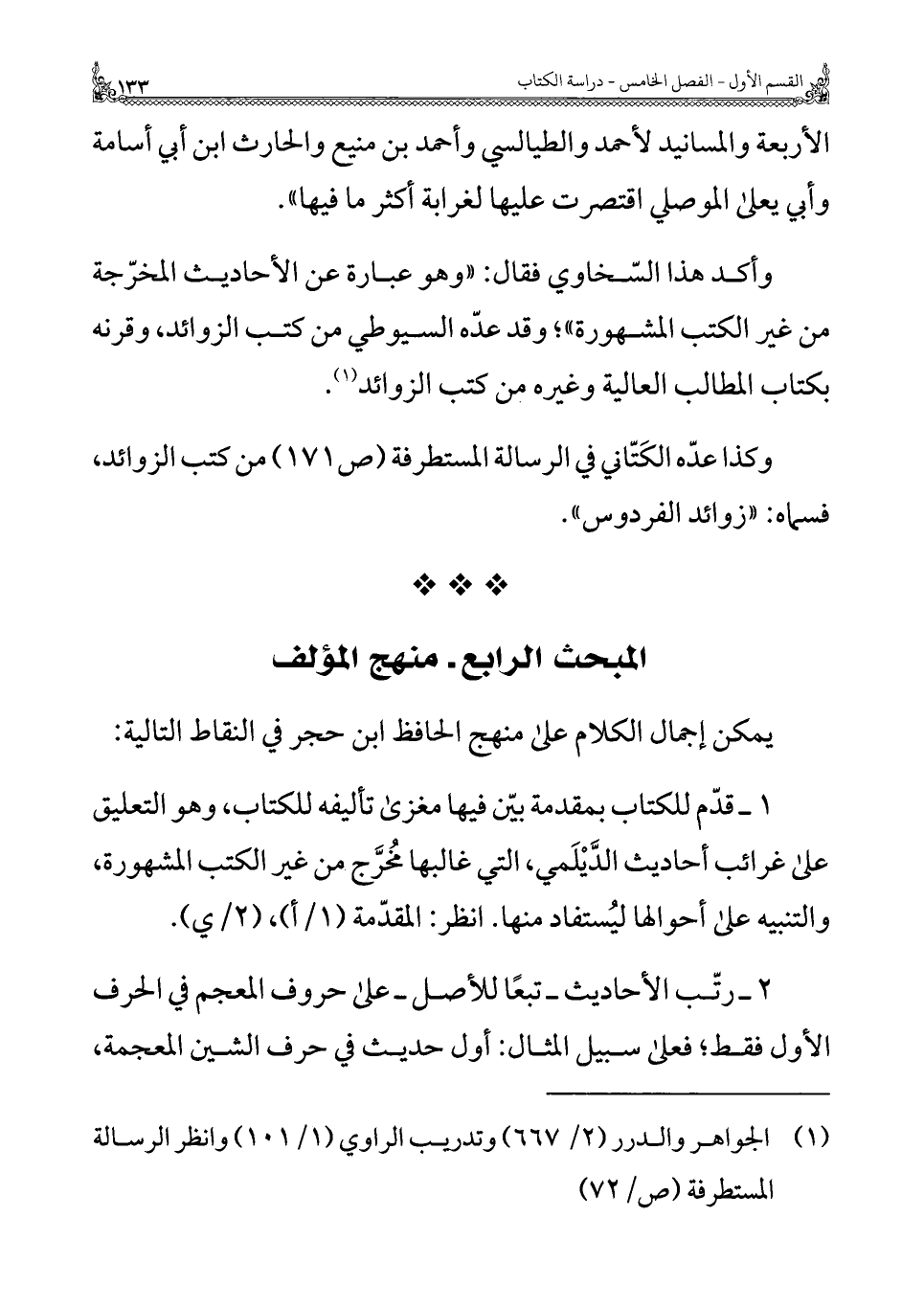وأكد هذا السّخاوي فقال: "وهو عبارة عن الأحاديث المخرّجة من غير الكتب المشهورة"؛ وقد عدّه السيوطي من كتب الزوائد، وقرنه بكتاب المطالب العالية وغيره من كتب الزوائد (¬١).