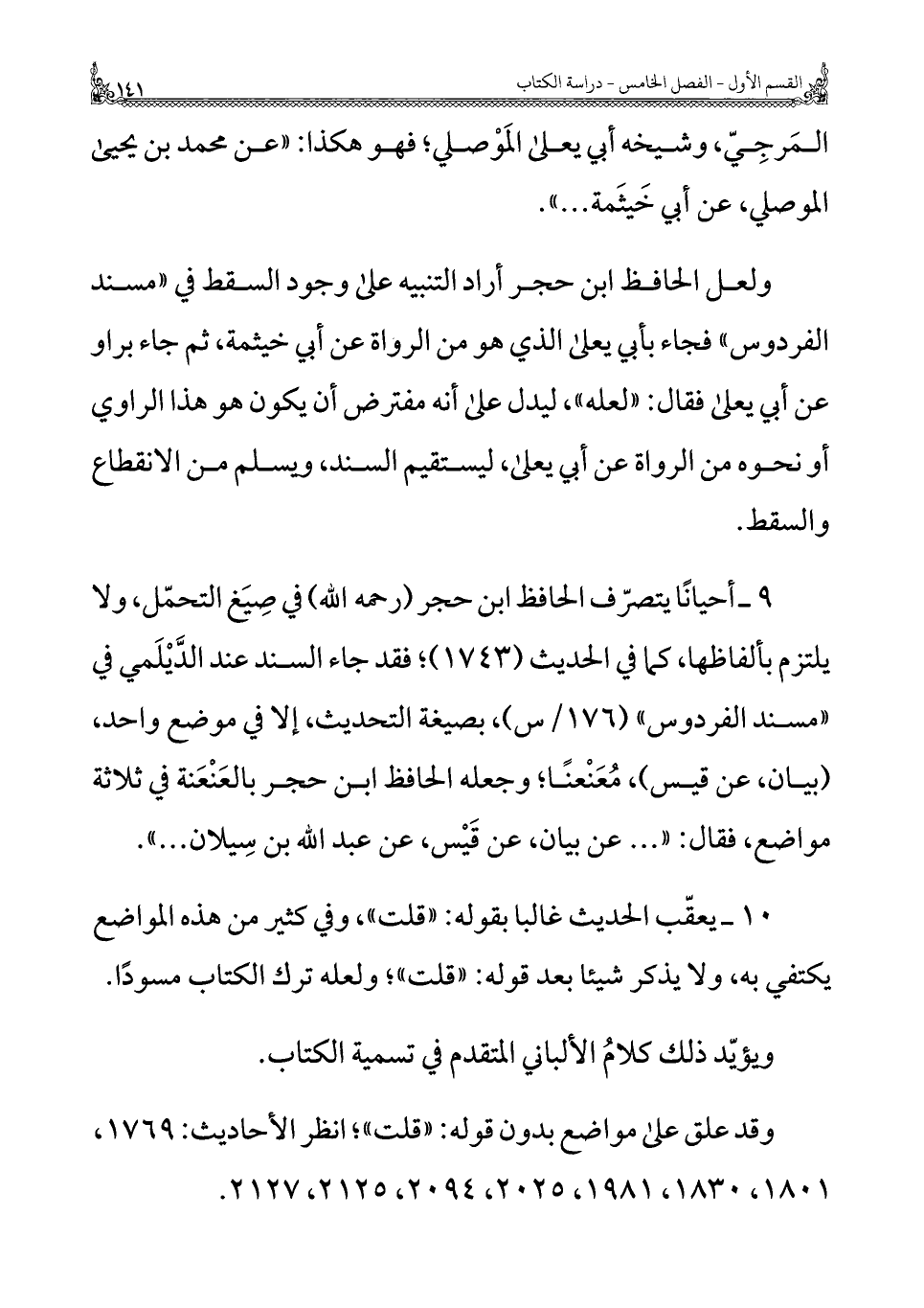 ولعل الحافظ ابن حجر أراد التنبيه على وجود السقط في "مسند الفردوس" فجاء بأبي يعلى الذي هو من الرواة عن أبي خيثمة، ثم جاء براو عن أبي يعلى فقال: "لعله"، ليدل على أنه مفترض أن يكون هو هذا الراوي أو نحوه من الرواة عن أبي يعلى، ليستقيم السند، ويسلم من الانقطاع والسقط.