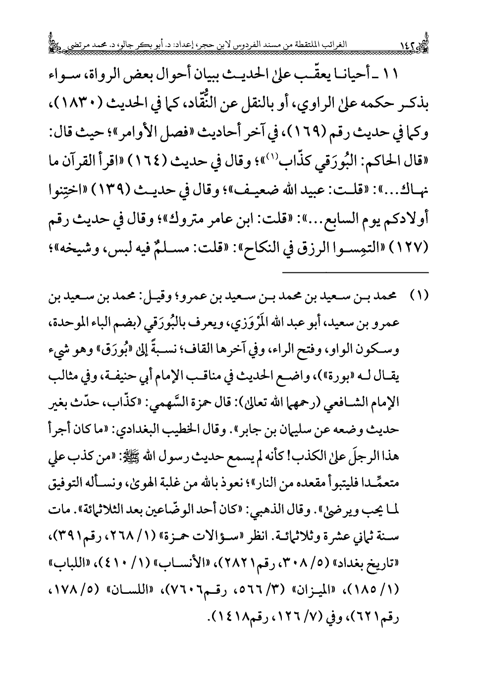 ١١ - أحيانًا يعقّب على الحديث ببيان أحوال بعض الرواة، سواء بذكر حكمه على الراوي، أو بالنقل عن النّقاد، كما في الحديث (١٨٣٠)، وكما في حديث رقم (١٦٩)، في آخر أحاديث "فصل الأوامر"؛ حيث قال: "قال الحاكم: البُورَقي كذّاب (¬١) "؛ وقال في حديث (١٦٤) "اقرأ القرآن ما نهاك ... ": "قلت: عبيد الله ضعيف"؛ وقال في حديث (١٣٩) "اختِنوا أولادكم يوم السابع ... ": "قلت: ابن عامر متروك"؛ وقال في حديث رقم (١٢٧) "التمِسوا الرزق في النكاح": "قلت: مسلمٌ فيه لبس، وشيخه"؛