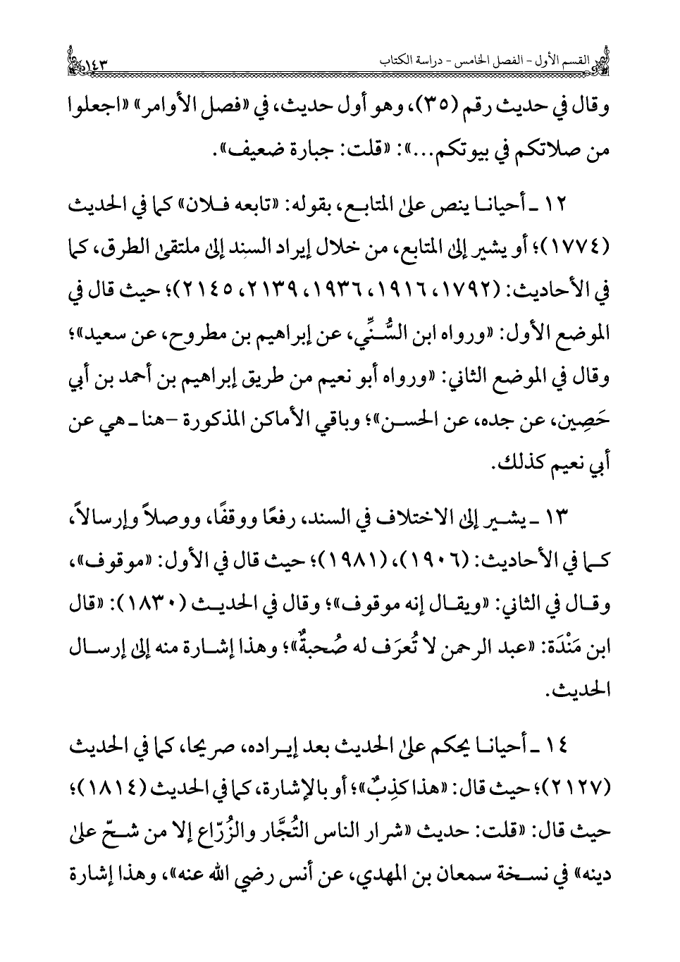 ١٣ - يشير إلى الاختلاف في السند، رفعًا ووقفًا، ووصلًا وإرسالًا، كما في الأحاديث: (١٩٠٦)، (١٩٨١)؛ حيث قال في الأول: "موقوف"، وقال في الثاني: "ويقال إنه موقوف"؛ وقال في الحديث (١٨٣٠): "قال ابن مَنْدَة: "عبد الرحمن لا تُعرَف له صُحبةٌ"؛ وهذا إشارة منه إلى إرسال الحديث.
