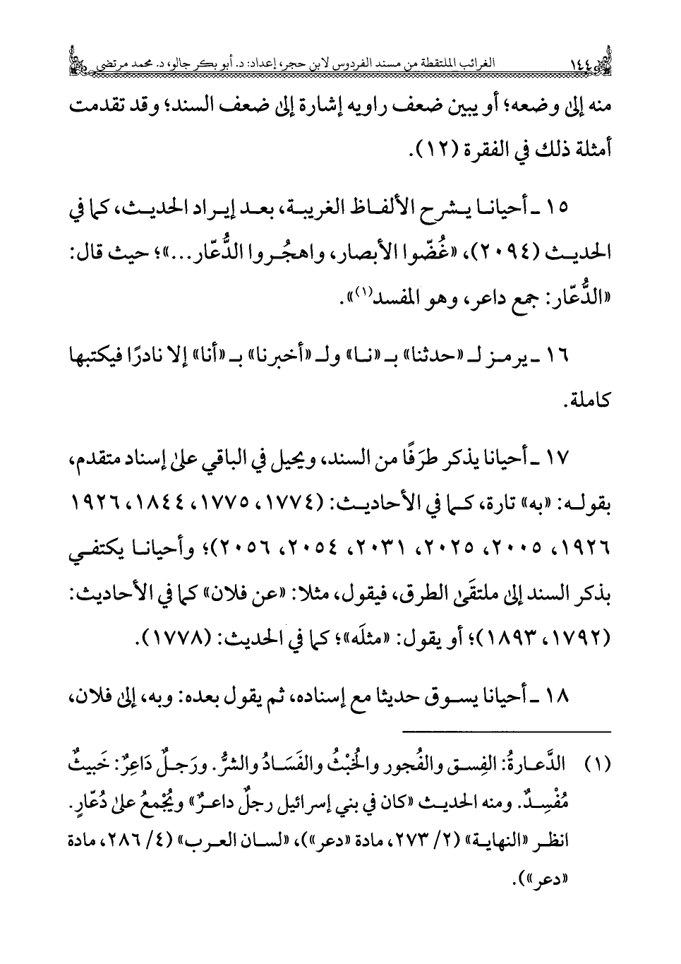 ١٥ - أحيانًا يشرح الألفاظ الغريبة، بعد إيراد الحديث، كما في الحديث (٢٠٩٤)، "غُضّوا الأبصار، واهجُروا الدُّعّار. . ."؛ حيث قال: "الدُّعّار: جمع داعر، وهو المفسد (¬١) ".