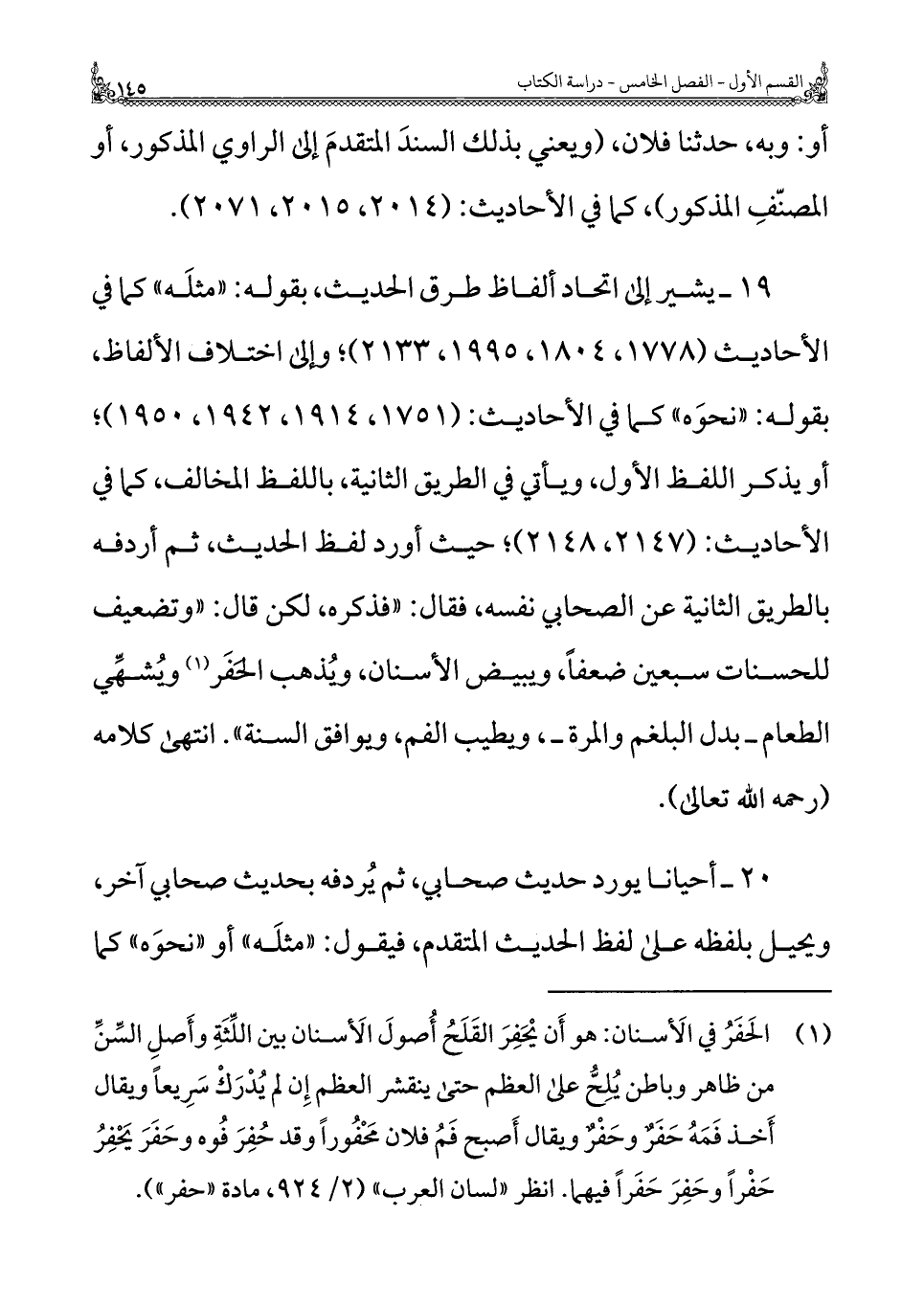١٩ - يشير إلى اتحاد ألفاظ طرق الحديث، بقوله: "مثلَه" كما في الأحاديث (١٧٧٨، ١٨٠٤، ١٩٩٥، ٢١٣٣)؛ وإلى اختلاف الألفاظ، بقوله: "نحوَه" كما في الأحاديث: (١٧٥١، ١٩١٤، ١٩٤٢، ١٩٥٠)؛ أو يذكر اللفظ الأول، ويأتي في الطريق الثانية، باللفظ المخالف، كما في الأحاديث: (٢١٤٧، ٢١٤٨)؛ حيث أورد لفظ الحديث، ثم أردفه بالطريق الثانية عن الصحابي نفسه، فقال: "فذكره، لكن قال: "وتضعيف للحسنات سبعين ضعفًا، ويبيض الأسنان، ويُذهب الحفَر (¬١) ويُشهِّي الطَّعام - بدل البلغم والمرة -، ويطيب الفم، ويوافق السنة". انتهى كلامه (رحمه الله تعالى).