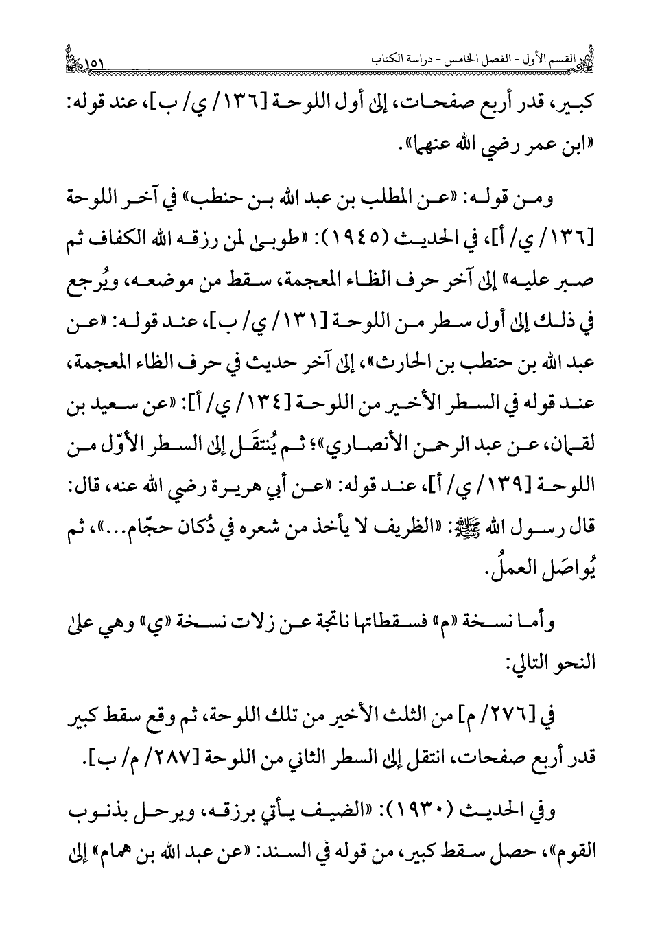 ومن قوله: "عن المطلب بن عبد الله بن حنطب" في آخر اللوحة، في الحديث (١٩٤٥): "طوبى لمن رزقه الله الكفاف ثم صبر عليه" إلى آخر حرف الظاء المعجمة، سقط من موضعه، ويرجع في ذلك إلى أول سطر من اللوحة، عند قوله: "عن عبد الله بن حنطب بن الحارث"، إلى آخر حديث في حرف الظاء المعجمة، عند قوله في السطر الأخير من اللوحة: "عن سعيد بن لقمان، عن عبد الرحمن الأنصاري"؛ ثم يُنتقَل إلى السطر الأول من اللوحة، عند قوله: "عن أبي هريرة رضي الله عنه، قال: قال رسول الله -صلى الله عليه وسلم -: "الظريف لا يأخذ من شعره في دُكان حجّام ... "، ثم يُواصَل العملُ.