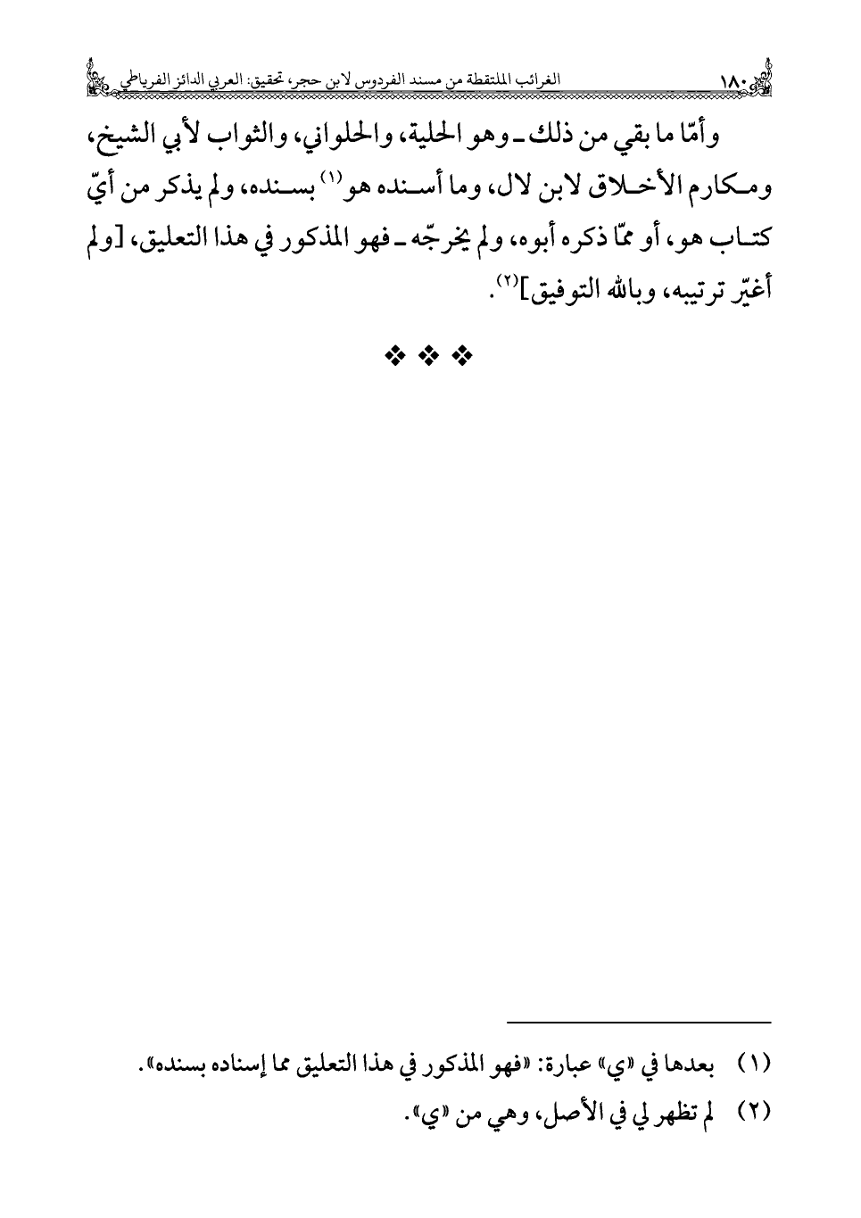 وأمّا ما بقي من ذلك - وهو الحلية، والحلواني، والثواب لأبي الشيخ، ومكارم الأخلاق لابن لال، وما أسنده هو (¬١) بسنده، ولم يذكر من أيّ كتاب هو، أو ممّا ذكره أبوه، ولم يخرجّه -فهو المذكور في هذا التعليق، [ولم أغيّر ترتيبه، وبالله التوفيق] (¬٢).