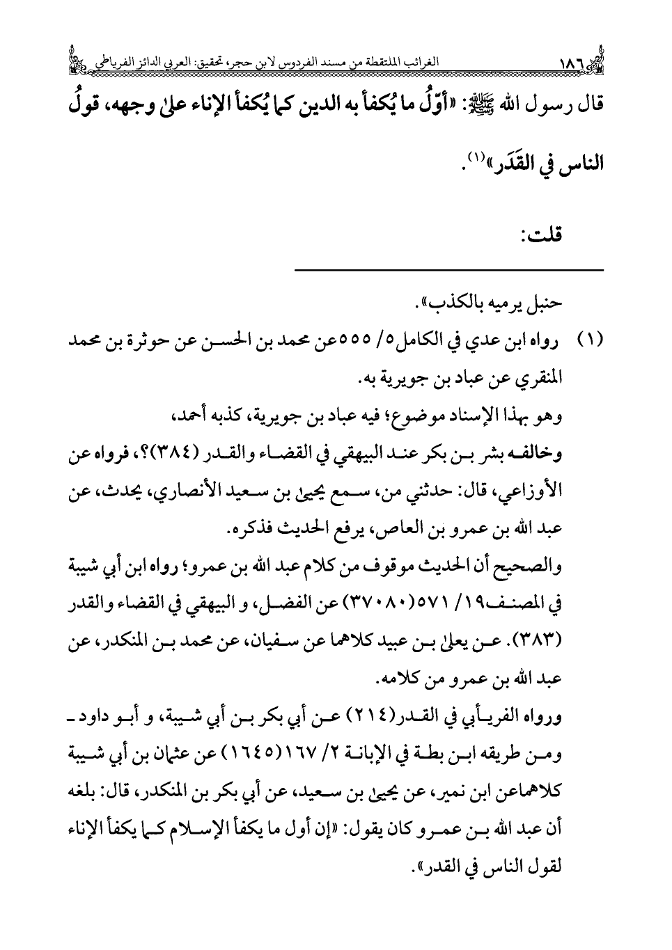 ورواه الفريابي في القدر (٢١٤) عن أبي بكر بن أبي شيبة، وأبو داود - ومن طريقه ابن بطة في الإبانة ٢/ ١٦٧ (١٦٤٥) عن عثمان بن أبي شيبة كلاهما عن ابن نمير، عن يحيى بن سعيد، عن أبي بكر بن المنكدر، قال: بلغه أن عبد الله بن عمرو كان يقول: "إن أول ما يكفأ الإسلام كما يكفا الإناء لقول الناس في القدر".