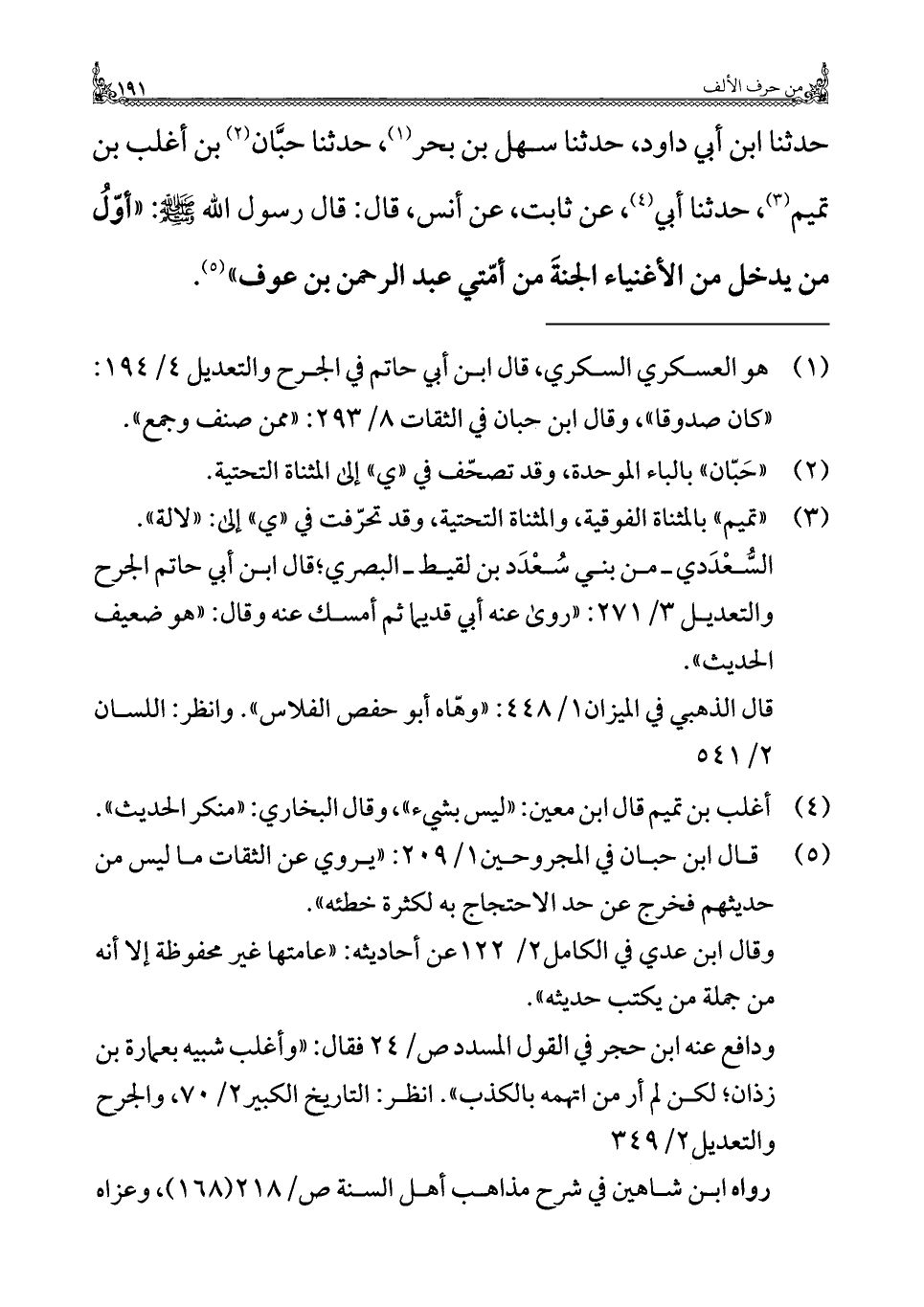 حدثنا ابن أبي داود، حدثنا سهل بن بحر (¬١)، حدثنا حبَّان (¬٢) بن أغلب بن تميم (¬٣)، حدثنا أبي (¬٤)، عن ثابت، عن أنس، قال: قال رسول الله -صلى الله عليه وسلم -: "أوّلُ من يدخل من الأغنياء الجنةَ من أمّتي عبد الرحمن بن عوف" (¬٥).
